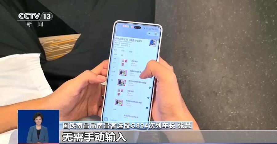 国铁南昌局南昌客运段G894次列车长 张慧:旅客可以通过扫描高铁座位扶手上的铁路畅行码进行点餐。进入页面后,可以查询购买列车上售卖的餐食和饮料,也可以提前预订沿线车站的“高铁外卖”,而且乘车信息和座位号会自动填入页面,无需手动输入。