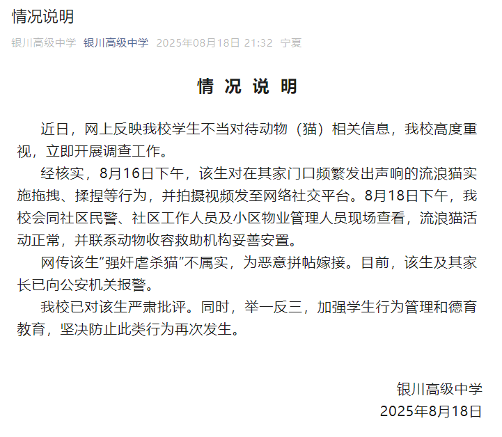 银川高级中学回应“学生拖拽流浪猫”:已对该生严肃批评,网传“虐杀猫”不属实,为恶意拼接