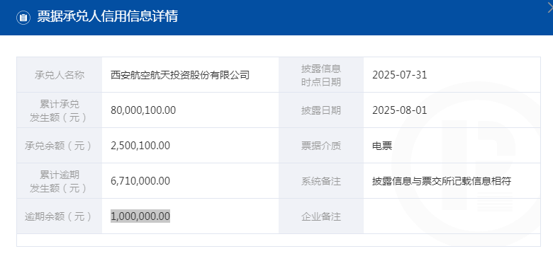 票据持续逾期,西安航空航天投资股份有限公司逾期余额100万元