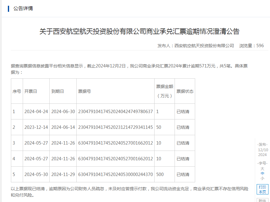 值得注意的是,2024年12月10日,西安航空航天投资股份有限公司曾发布关于西安航空航天投资股份有限公司商业承兑汇票逾期情况澄清公告。公告显示,据查询票据信息披露平台相关信息显示,截止2024年12月2日,该公司商业承兑汇票2024年累计逾期571万元,共5笔。相关票据已结清,逾期原因为公司财务人员疏忽,未及时应答提示付款,我公司流动资金充足,商业承兑汇票不存在信用风险和兑付风险。针对逾期余额显示的100万元,该公司尚未发布相关公告。