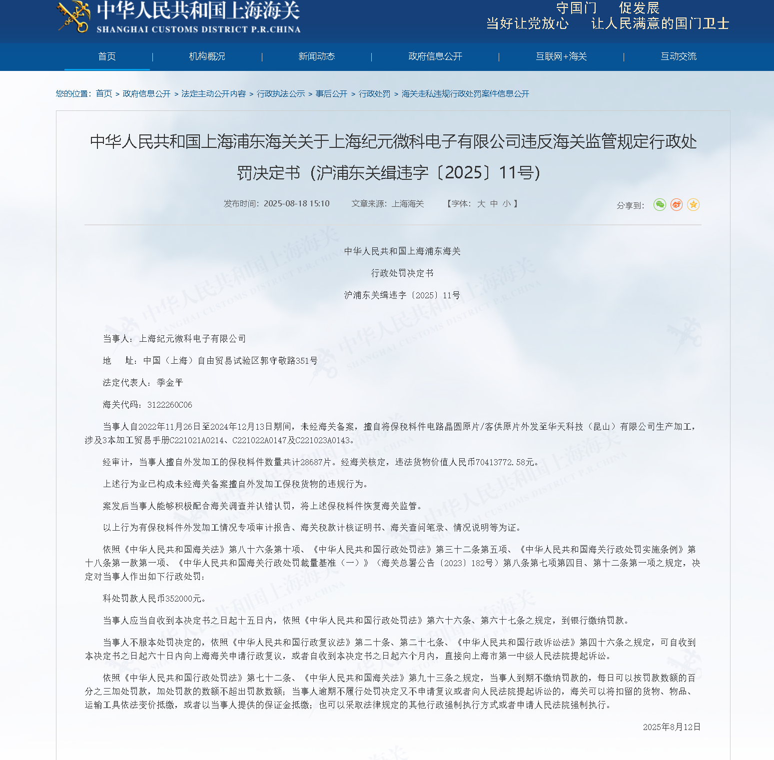 近日,中华人民共和国上海浦东海关发布关于上海纪元微科电子有限公司(下称“微科电子”)违反海关监管规定行政处罚决定书(沪浦东关缉违字〔2025〕11号)。