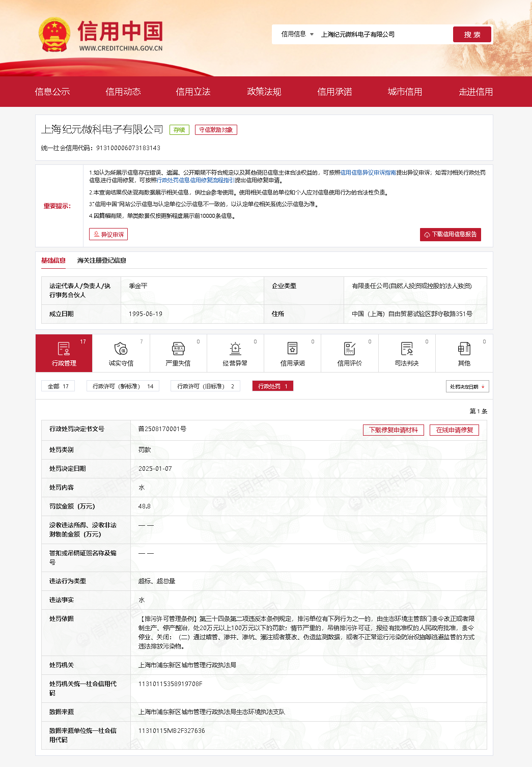齐鲁晚报·齐鲁壹点记者从信用中国获悉,2025年1月,微科电子因环保问题,被上海市浦东新区城市管理行政执法局罚款48.8万元。