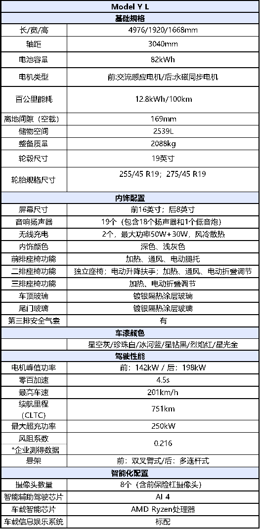附:Model Y L参数配置表: