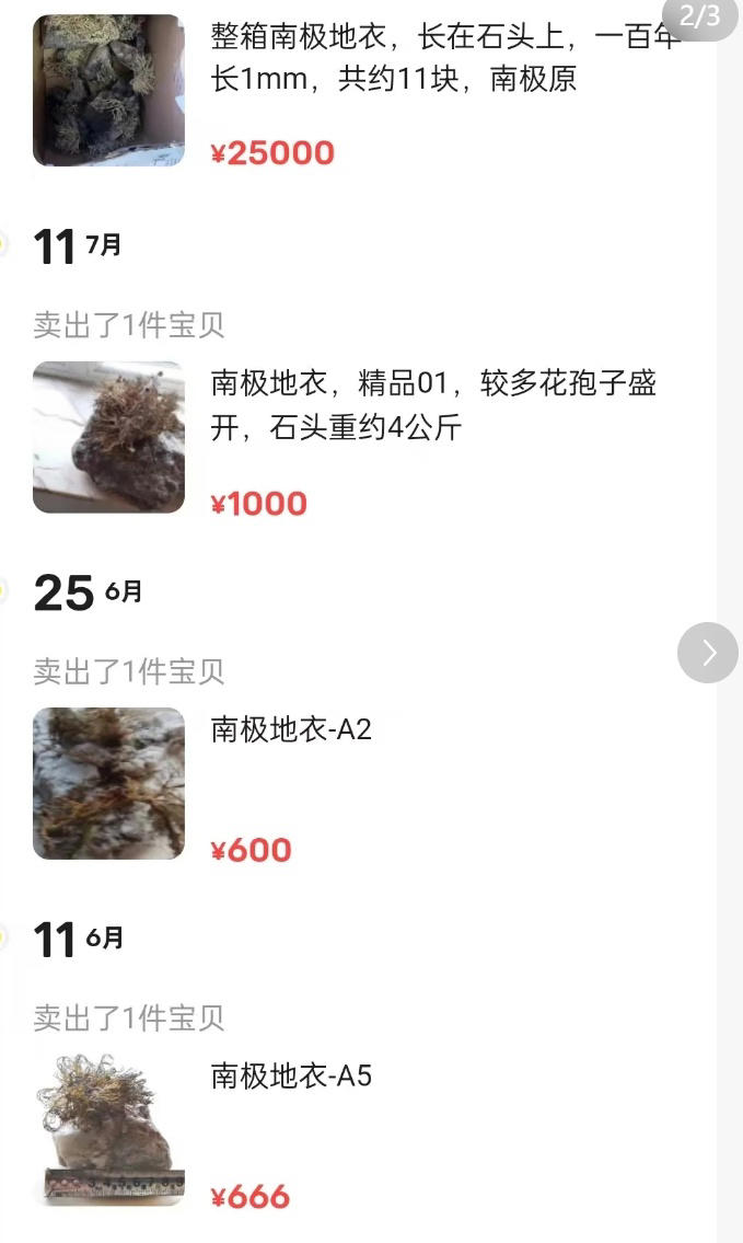 媒体记者以买家身份咨询售卖者地衣是否为南极带回,对方先称“今年带回来的,朋友的,必须南极的”。商家后又否认,改口称,“这是云南树林里的地衣,跟南极地衣同类型,不是南极的”。19日,该售卖者主页商品已下架。