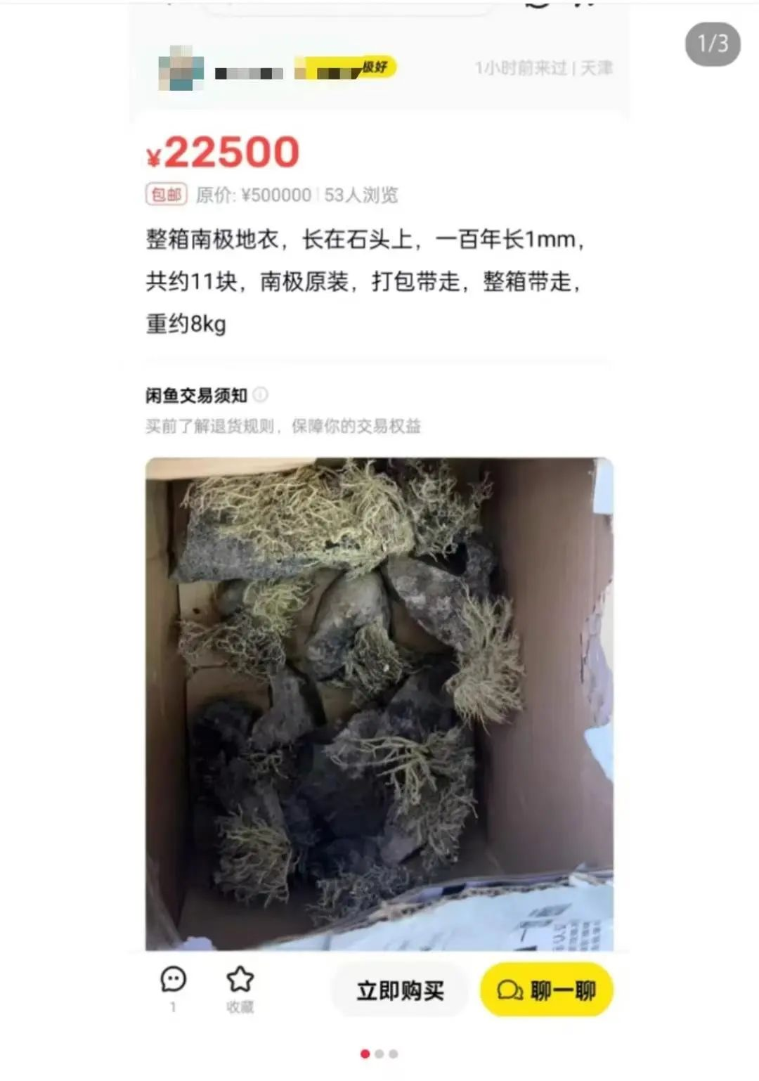 交易平台显示,该商品的描述写道:“整箱南极地衣,长在石头上,一百年长1毫米,共约11块,南极原装。”售价标注为22500元。