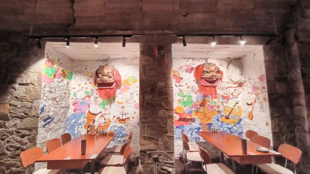 今年,刘公岛码头对面的一处沉寂的防空洞悄然“新生”,成了一处特色海鲜餐厅。外观质朴无华,内里却别有洞天。餐厅在改造装修时特意保留了防空洞的顶板和侧墙,斑驳的岁月痕迹清晰可见。一盏盏造型古朴的吊灯洒下暖光,为一张张桌椅平添温馨,墙中间的凹洞处被画上了可爱的彩绘,两个醒目的舞狮头点缀期间,成为点睛之笔。