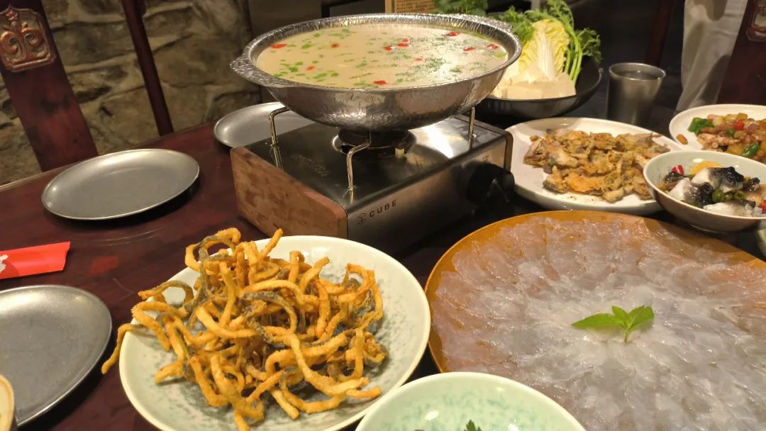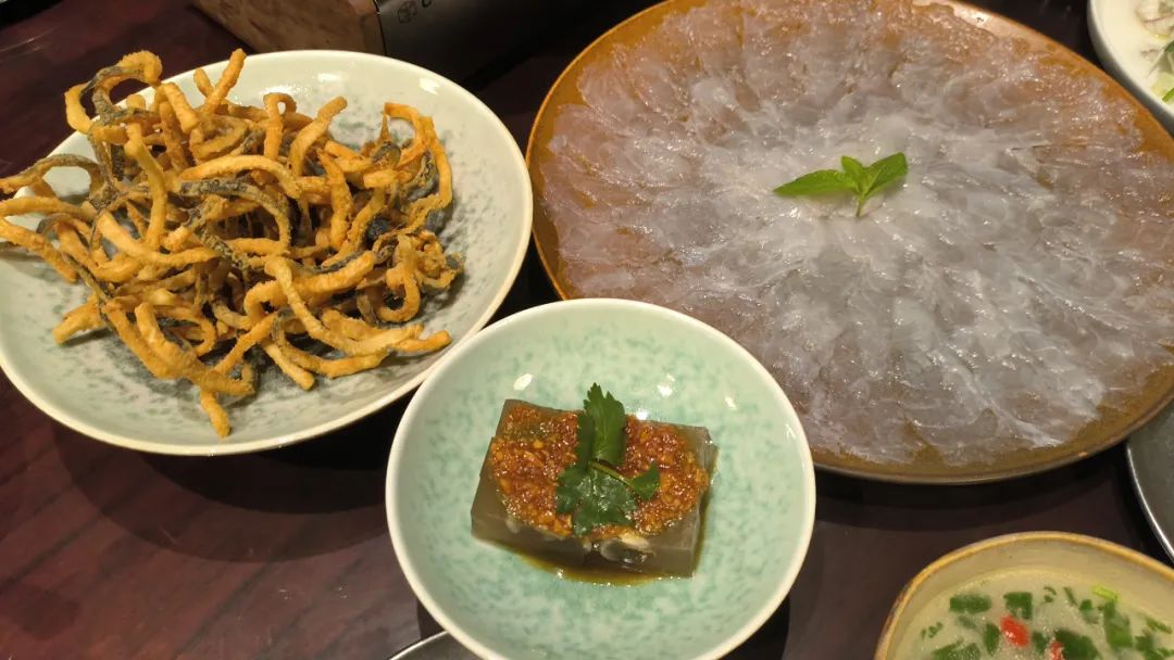 除了浸润文化气息的环境,店内菜品更是极富特色。不仅有地道家常海鲜,这家餐厅还把河豚做出了各种花样。凉拌、煲汤、鱼面、捞饭、火锅、刺身……个头不大的河豚经过大厨的巧手加工,就成了一桌特色全豚宴。