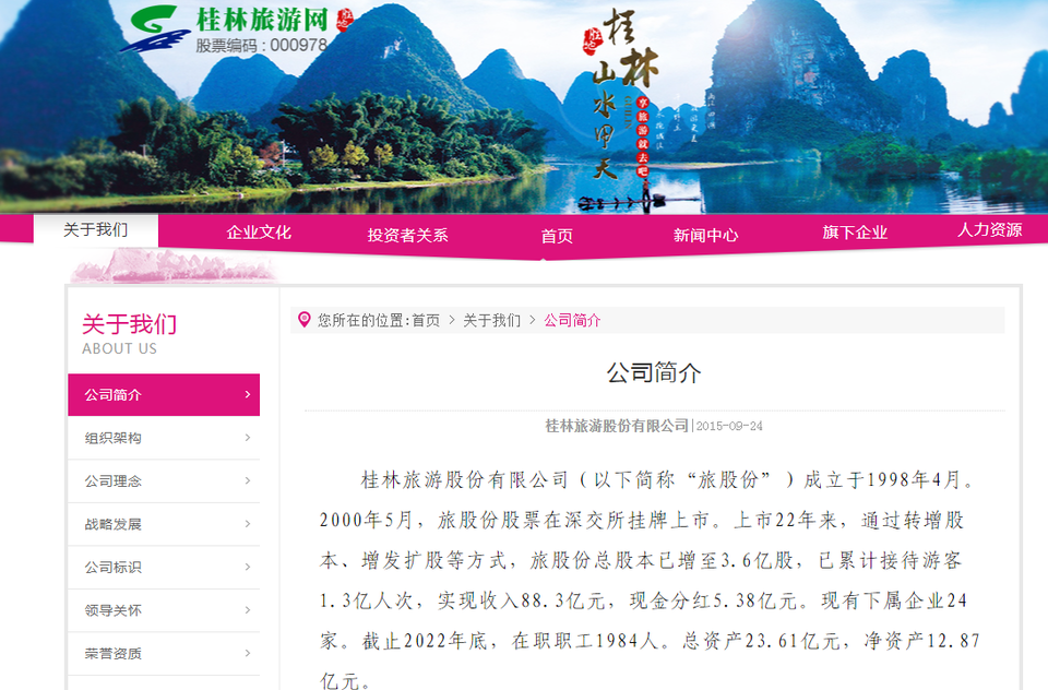 2000年5月,公司股票在深交所挂牌上市。上市22年来,通过转增股本、增发扩股等方式,旅股份总股本已增至3.6亿股,已累计接待游客1.3亿人次,实现收入88.3亿元,现金分红5.38亿元。现有下属企业24家。截止2022年底,在职职工1984人。总资产23.61亿元,净资产12.87亿元。