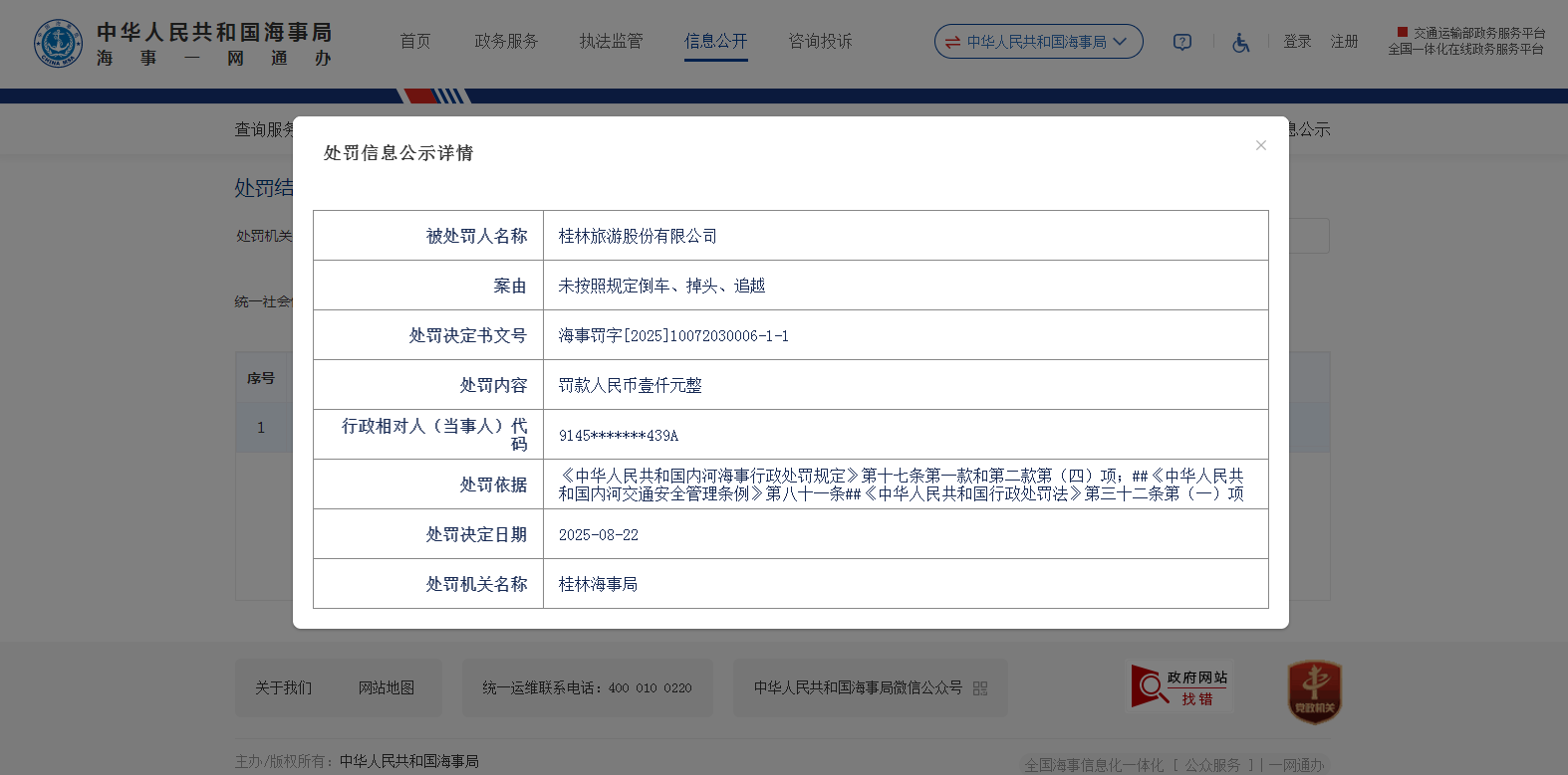 齐鲁晚报·齐鲁壹点记者于中国海事局监管信息公开栏获悉,8月22日,桂林旅游(000978.SZ)收行政处罚决定书,处罚决定书文号为海事罚字[2025]10072030006-1-1。