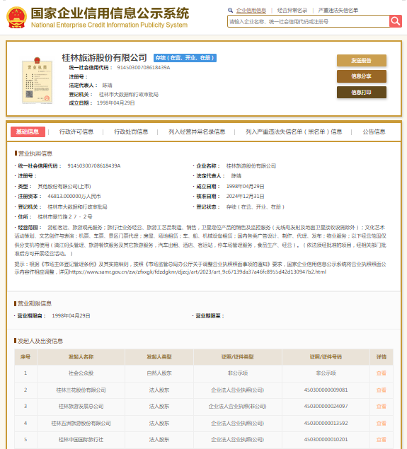 国家企业信用信息公示系统显示,桂林旅游股份有限公司成立于1998年,注册资本46813万元人民币,法定代表人为陈靖。