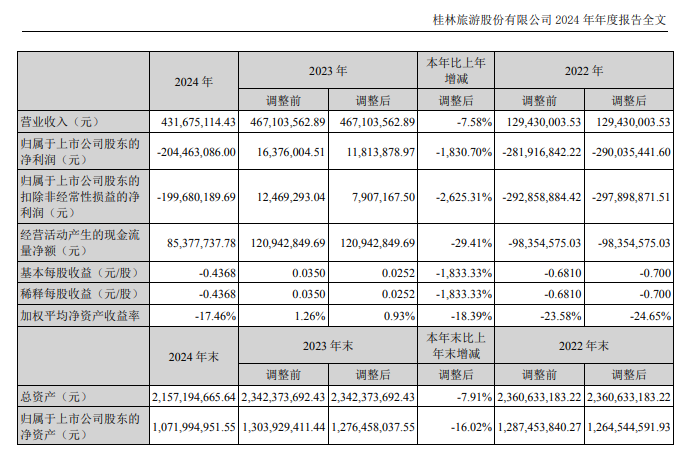 资料显示,2024 年,公司实现营业收入4.32 亿元,同比减少7.58%;归母净亏损约2.04亿元,同比暴跌1830.7%。据4月29日桂林旅游一季报,2025年一季度公司营业收入为8263万元,同比下降6.6%;归母净亏损由上年同期的1341万元缩至1308万元,亏损有所收窄,但业绩仍不乐观。