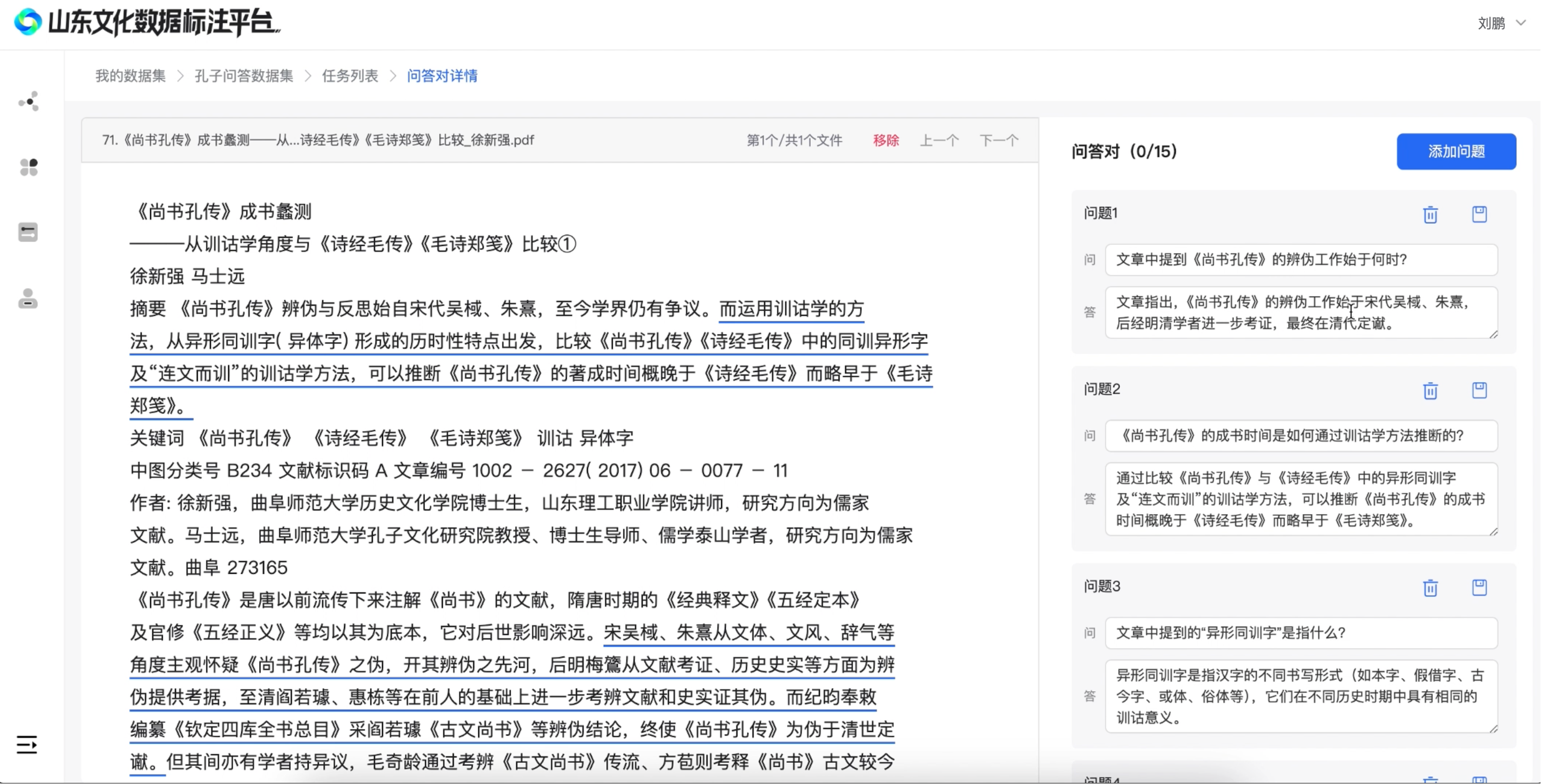 “山东数文集团自主研发打造山东文化数据标注平台,提供数据采集、清洗、预标注、标注、增强、审核等一站式全链路服务,支持问答、图片、视频、音频、文件、图谱等多类型数据标注。”山东数文集团技术总监宋耀介绍。标注过程遵循标准化流程。用户提交原始素材入库至统一数据源,完成数据采集与归集;后台剔除重复样本及低质量内容后,完成数据清洗与筛选;核心文本数据自动标注并解析文本语义,生成结构化问答对,通过AI增强功能自动实现问题泛化和答案多样性;在问答对生成后,人工进行精校和审核,以确保数据的完备性和准确性。