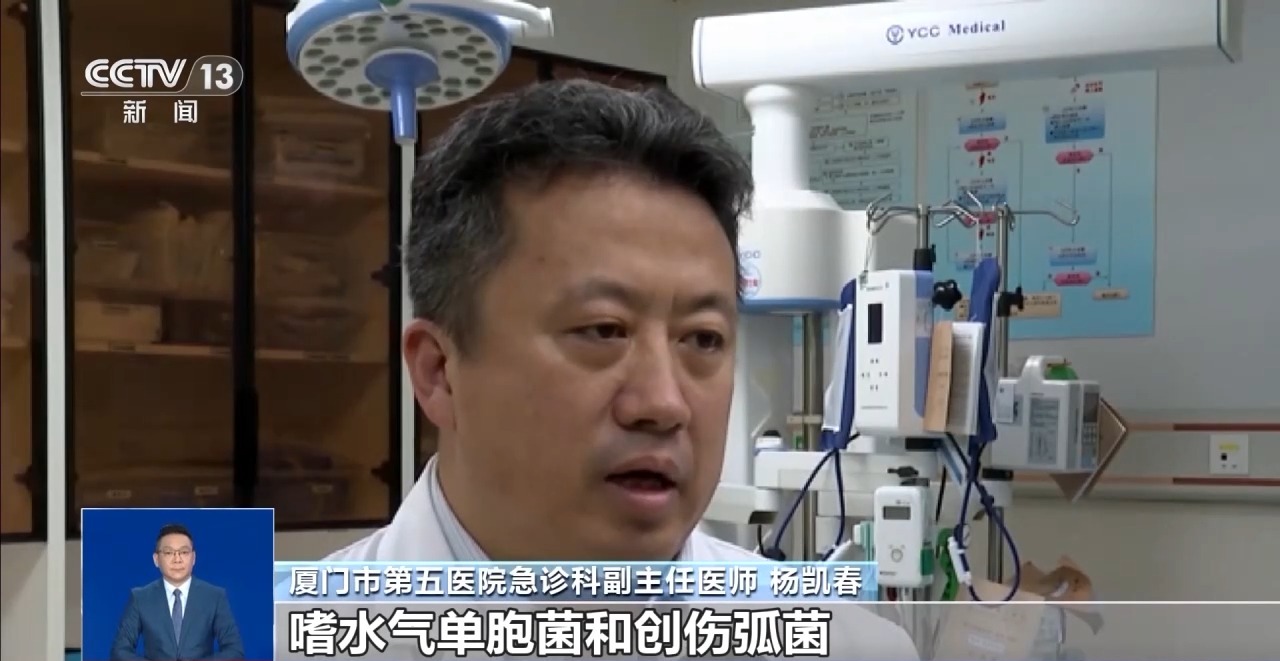 厦门市第五医院急诊科副主任医师 杨凯春:嗜水气单胞菌和创伤弧菌,它在水里面都是广泛存在的,如果被虾蟹或鱼刺伤或划伤,或有伤口被水污染都可能有感染。