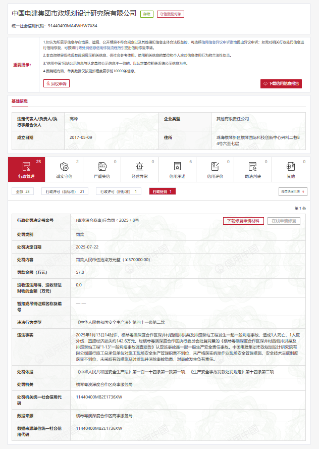 近日,记者从信用中国获悉,中国电建集团市政规划设计研究院有限公司因违反《中华人民共和国安全生产法》第四十一条第二款,被横琴粤澳深度合作区商事服务局罚款57万元。