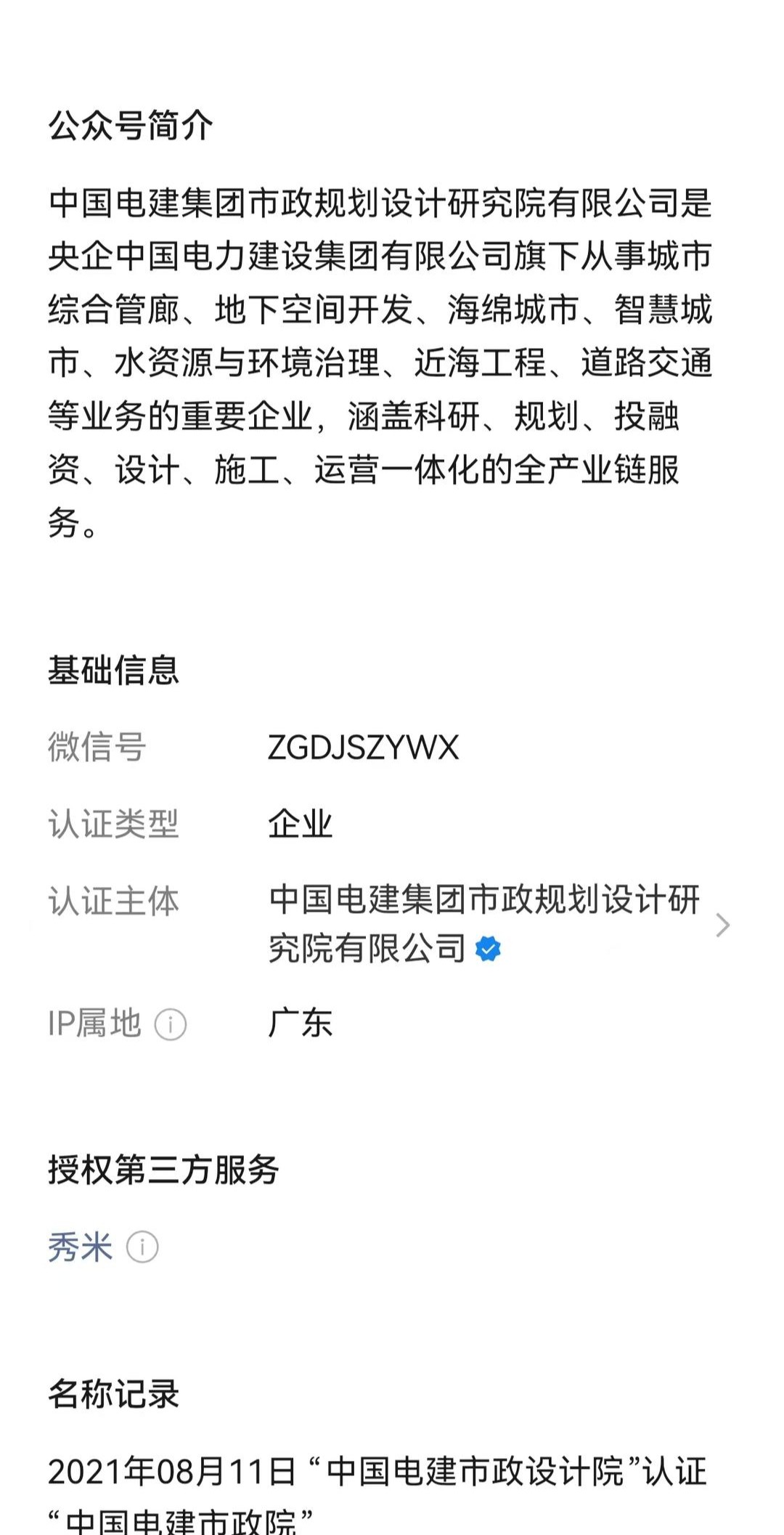 中国电建集团市政规划设计研究院有限公司官方公众号显示,中国电建集团市政规划设计研究院有限公司是央企中国电力建设集团有限公司旗下从事城市综合管廊、地下空间开发、海绵城市、智慧城市、水资源与环境治理、近海工程、道路交通等业务的重要企业,涵盖科研、规划、投融资、设计、施工、运营一体化的全产业链服务。