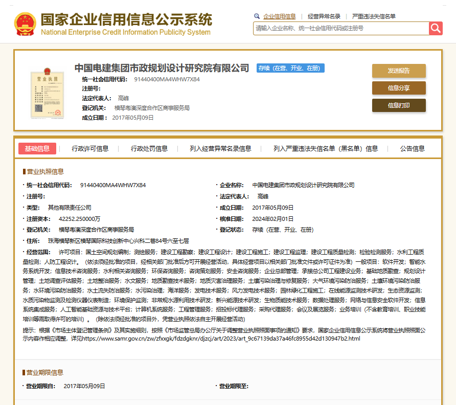 公开信息显示,中国电建集团市政规划设计研究院有限公司成立于2017年05月09日,法定代表人高峰。