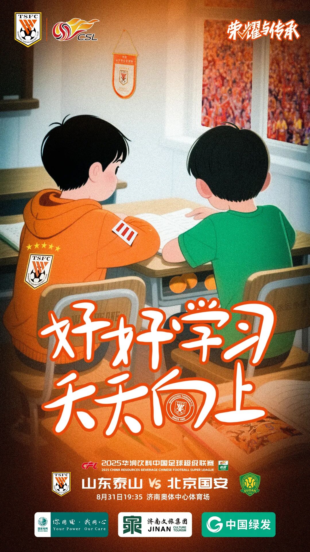 8月31日晚7:35,山东泰山将在主场迎来北京国安的挑战,俱乐部的赛前预热海报十分应景,借着即将到来的开学季,将主题定为《好好学习,天天向上》。