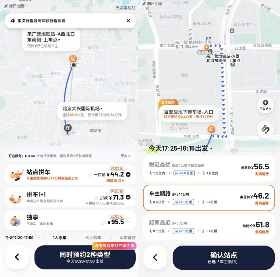 从价格看,站点拼车仅为顺风车“拼车1+1”的六成左右,且根据嘀嗒顺风车大数据,站点拼车订单平均距离比其他订单类型更长,这表明其满足了更多中长距离出行用户的需求。