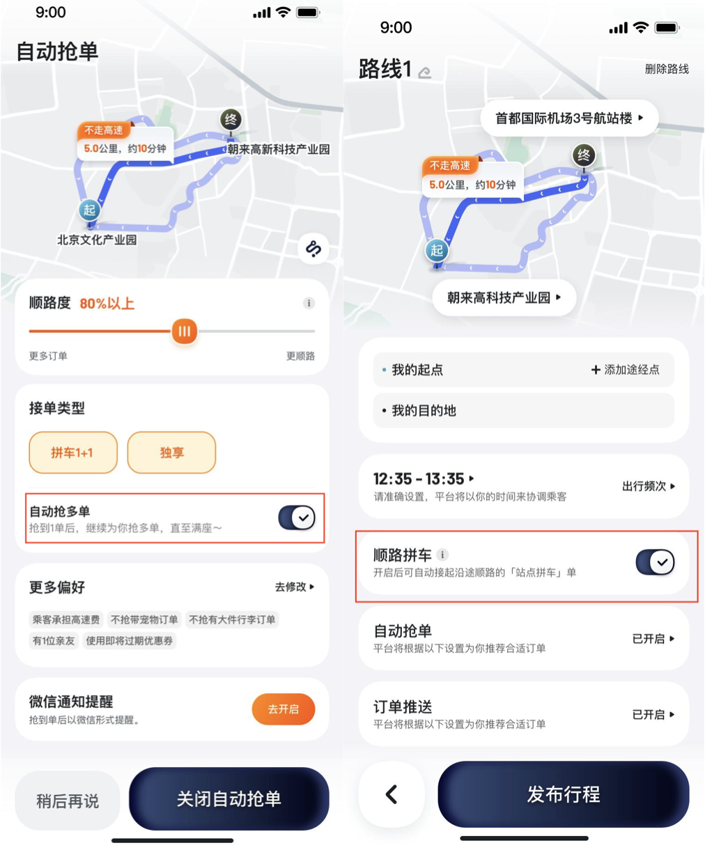 从效果看,目前顺路拼车的自动抢单功能(即车主可设置自动抢站点拼车订单)开启率持续提升,接单量持续增长,且抢单成功的车主下次接单再次开启该功能的比例超过八成。这表明,顺路拼车自动抢单功能体验得到车主充分认可。