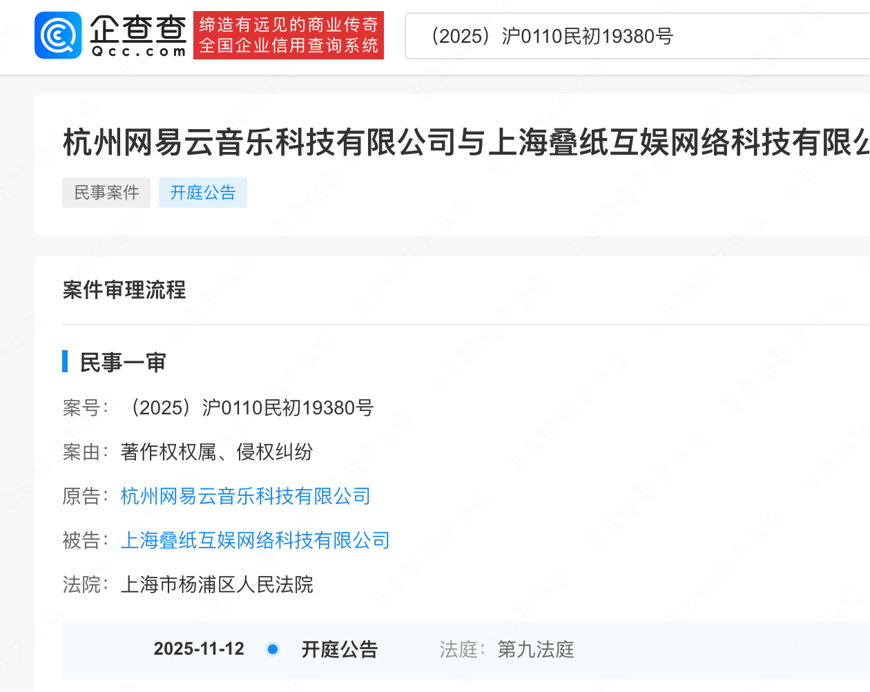企查查APP显示,近日,上海叠纸互娱网络科技有限公司新增一则开庭信息,原告为杭州网易云音乐科技有限公司,案由为著作权权属、侵权纠纷,案件将于11月12日在上海市杨浦区人民法院开庭审理。