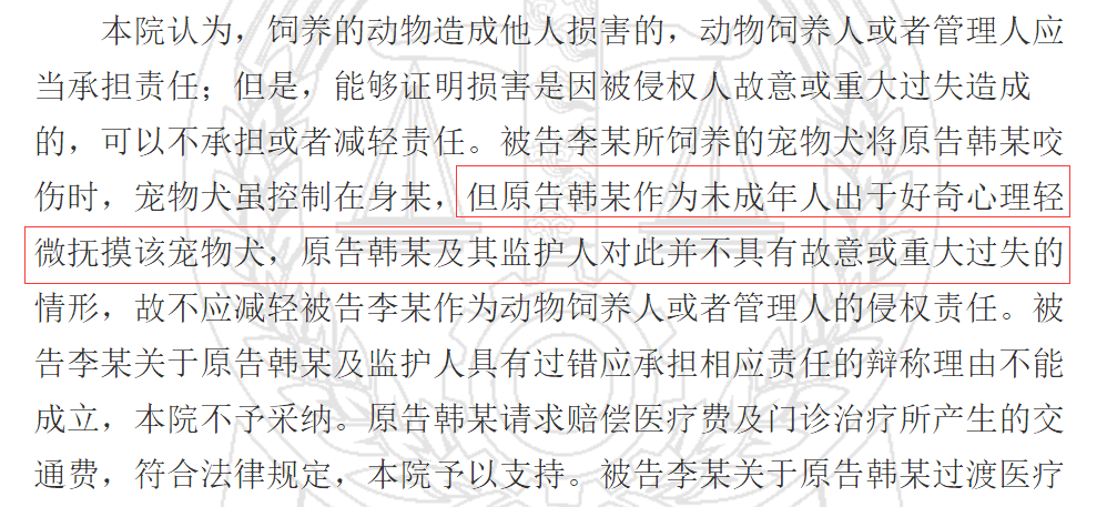法院认为,饲养的动物造成他人损害的,动物饲养人或者管理人应当承担责任;但是,能够证明损害是因被侵权人故意或重大过失造成的,可以不承担或者减轻责任。
