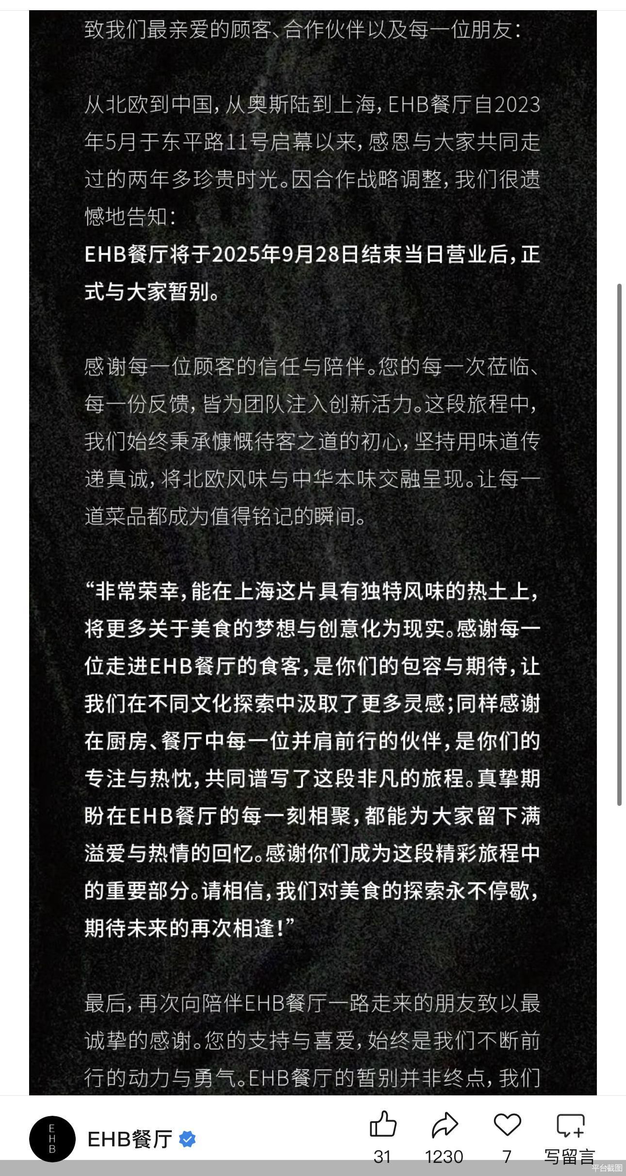 9月1日,米其林餐厅EHB餐厅通过社交平台与消费者暂别。