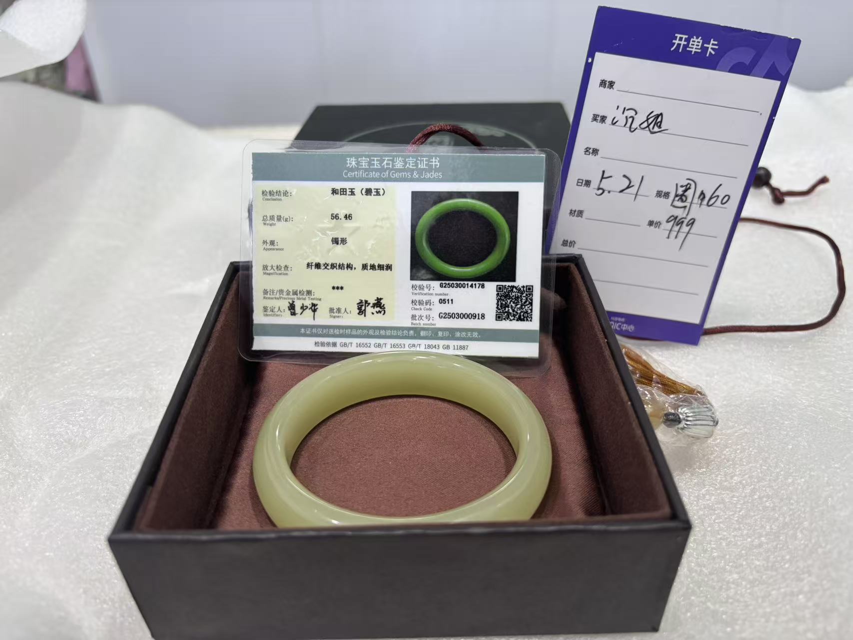 8月23日收到快递后,李女士发现实物与直播间宣传严重不符:手镯尺寸、颜色和质地均不像玉石,反而疑似玻璃制品。包裹中附有一张手写开单卡和一份珠宝玉石鉴定证书,证书显示该手镯为“和田玉(碧玉)”,但李女士对比后发现,实物与证书所描述的特征完全不符。她随后将问题反馈给店铺客服,对方却表示开单卡和证书并非店家提供,可能是“快递人员放入”,并强调该商品为“定制产品”,无法退货。