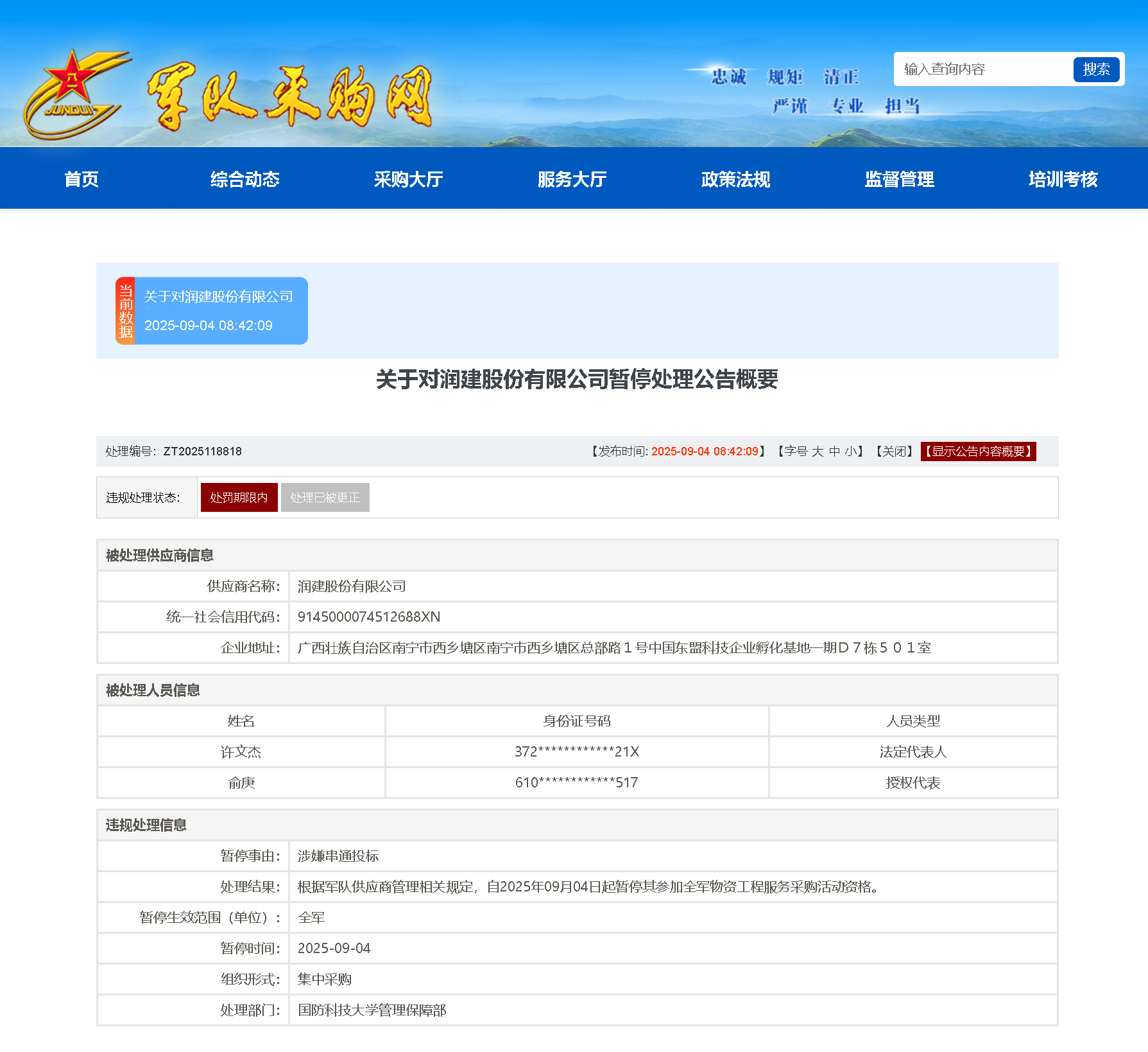 根据军队供应商管理相关规定,自2025年09月04日起暂停其参加全军物资工程服务采购活动资格。