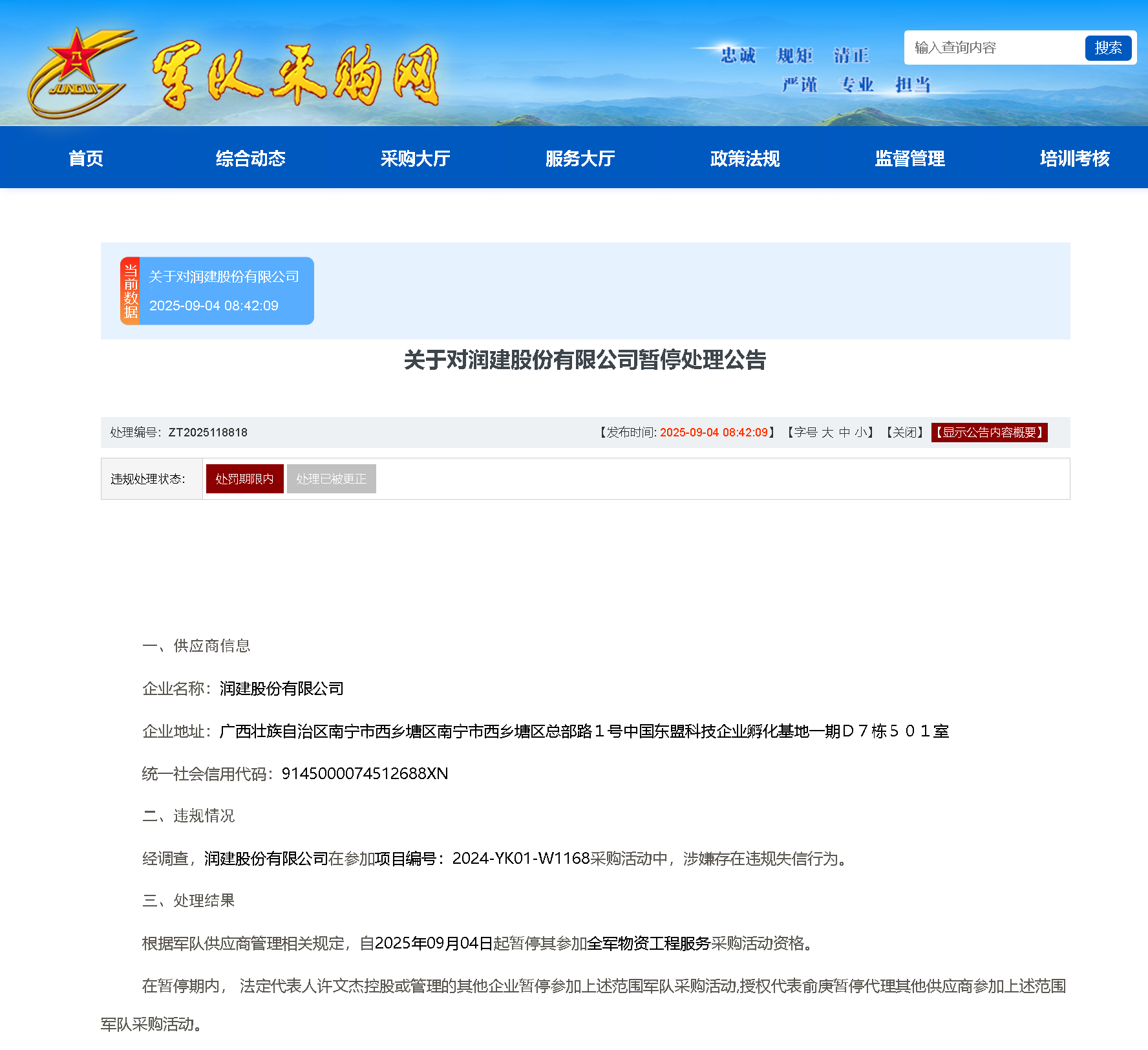 近日,军队采购网发布关于对润建股份有限公司暂停处理公告。
