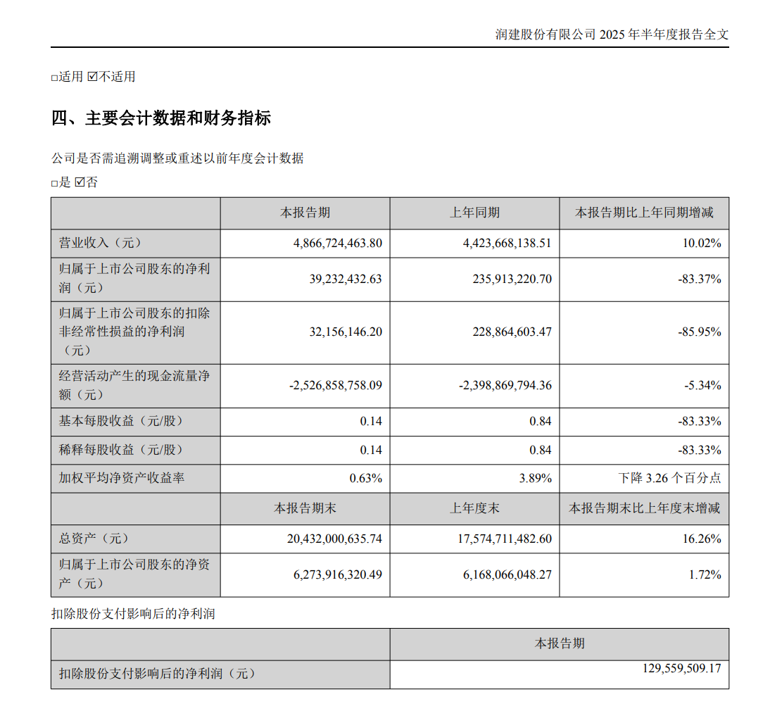润建股份近日公布2025年半年度报告显示,上半年公司实现营业收入48.67亿元,同比增长10.02%;归属于上市公司股东的净利润3923.24万元,同比下降83.37%;归属于上市公司股东的扣除非经常性损益的净利润3215.61万元,同比下降85.95%。