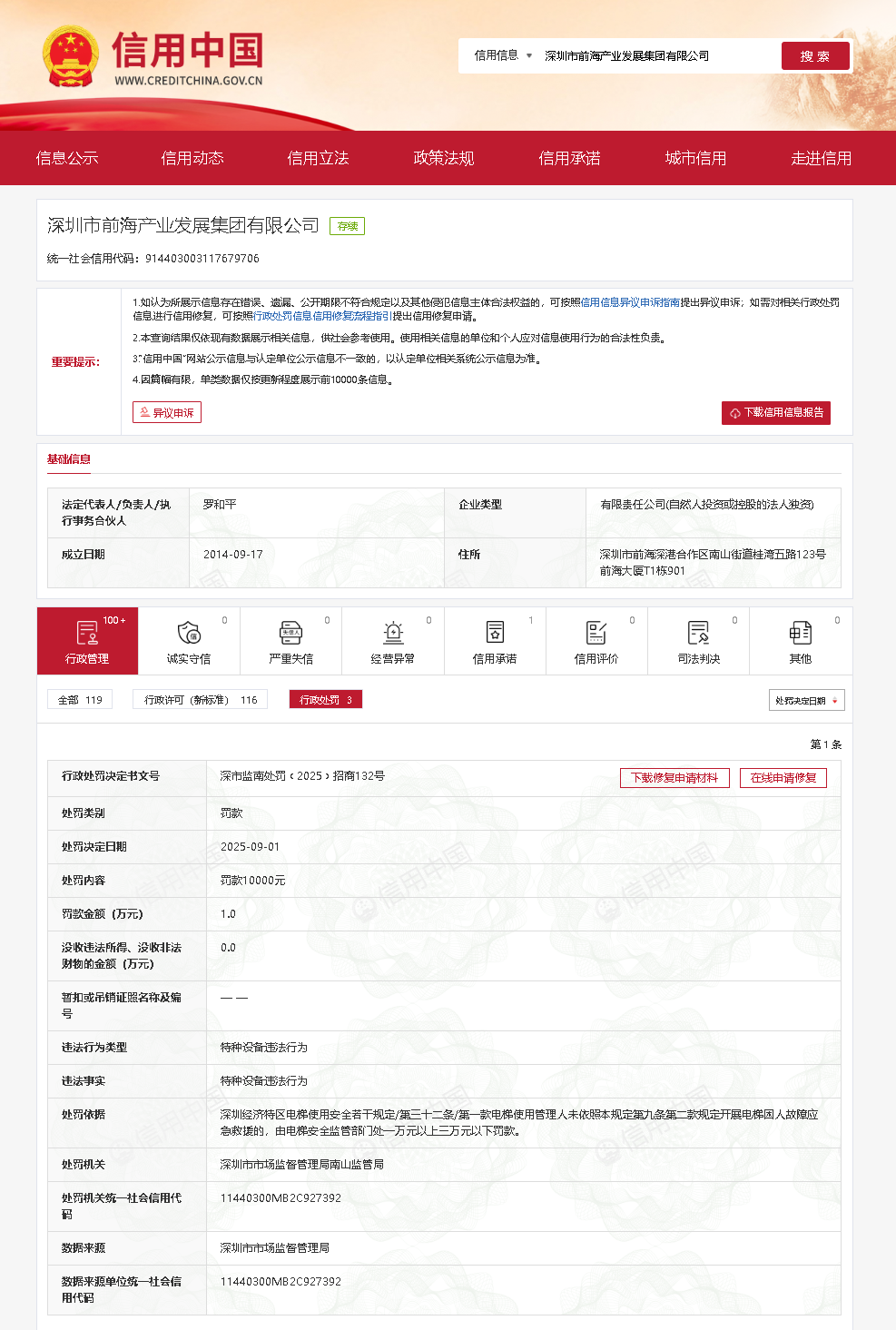 近日,齐鲁晚报·齐鲁壹点记者从信用中国获悉,深圳市前海产业发展集团有限公司因特种设备违法行为,被深圳市市场监督管理局南山监管局罚款1万元。