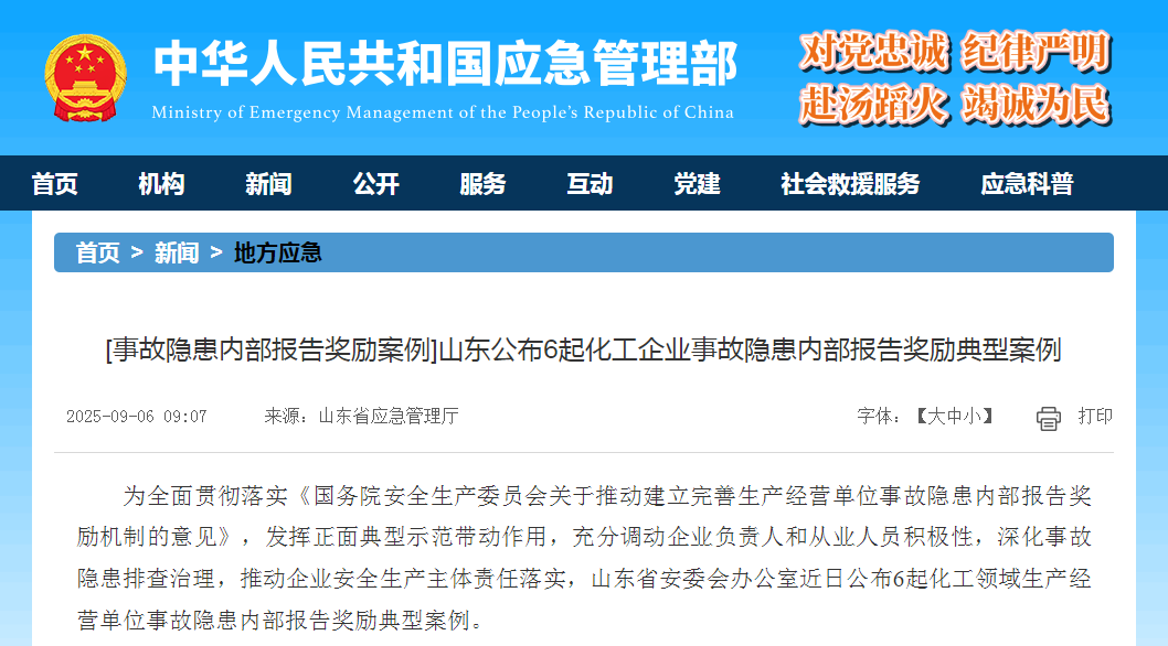 齐鲁晚报·齐鲁壹点记者于中国应急管理部“地方应急”栏了解到,山东省安委会办公室近日公布6起化工领域生产经营单位事故隐患内部报告奖励典型案例。其中,东营市海科瑞林化工有限公司(下称“海科瑞林”)因及时发现、消除事故隐患等,上榜该典型案例。