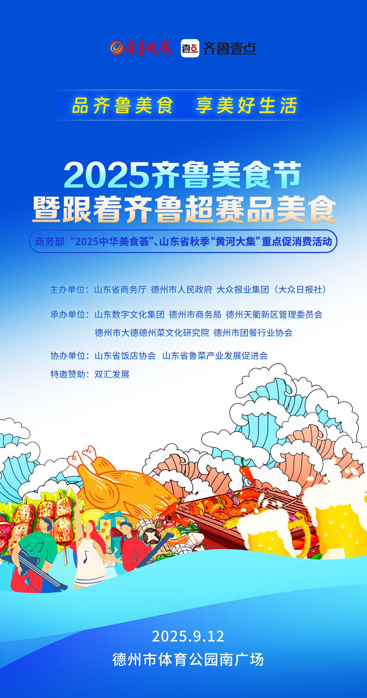 9月12日,由山东省商务厅、德州市人民政府、大众报业集团(大众日报社)联合主办,山东数字文化集团、德州市商务局等多单位共同承办,双汇发展特邀赞助的2025齐鲁美食节暨跟着齐鲁超赛品美食活动,将在德州市体育公园南广场盛大启幕。