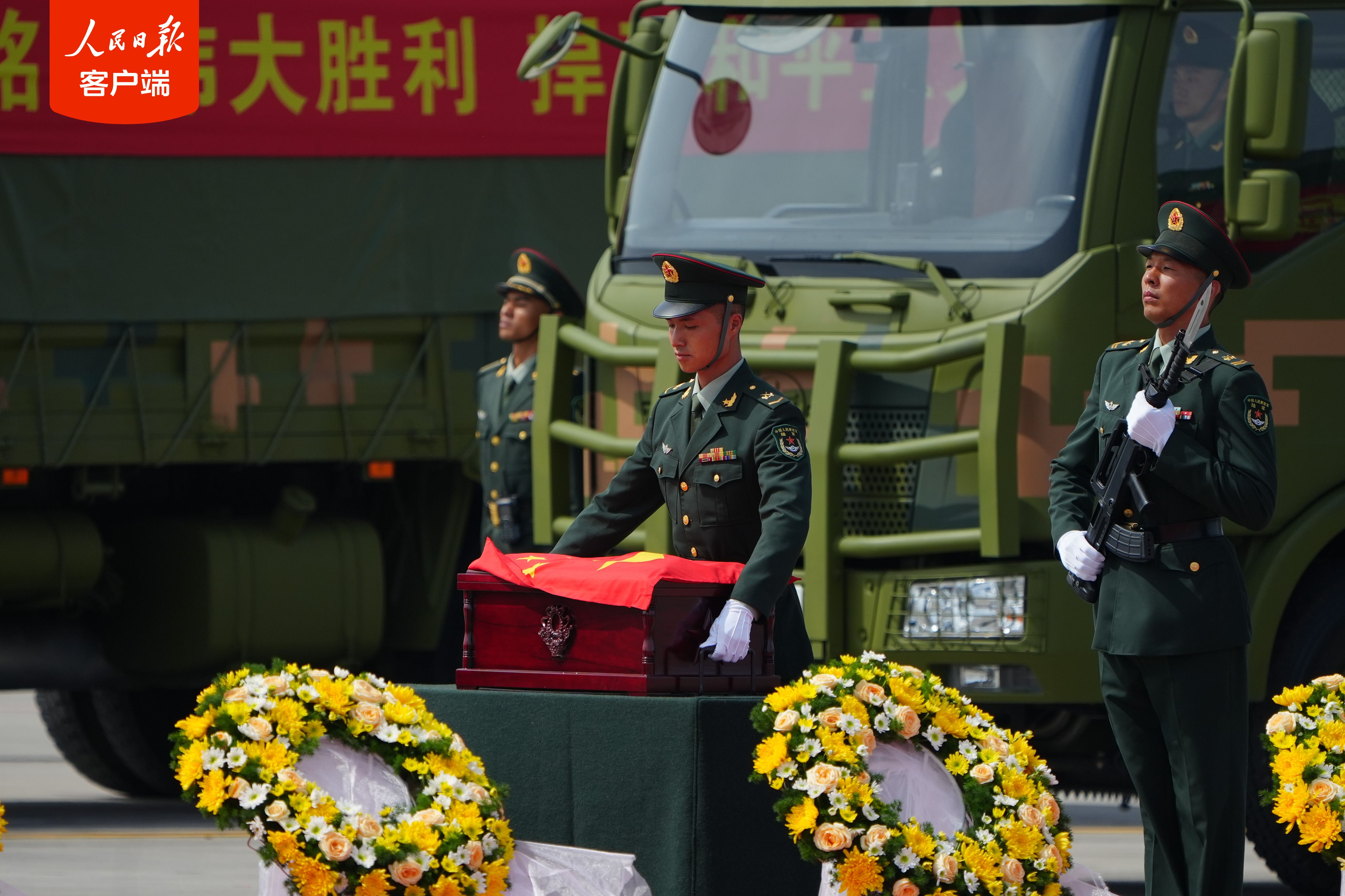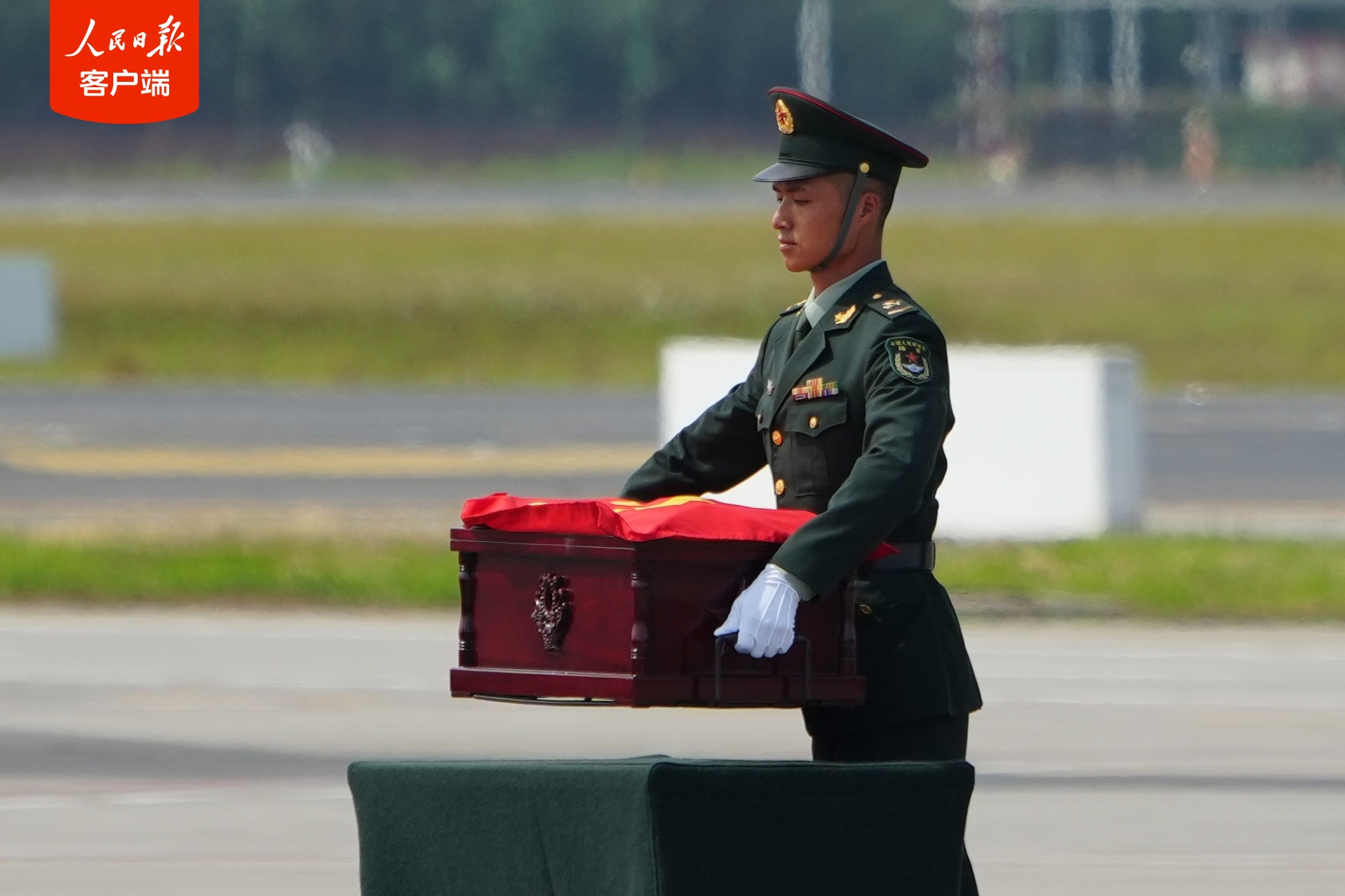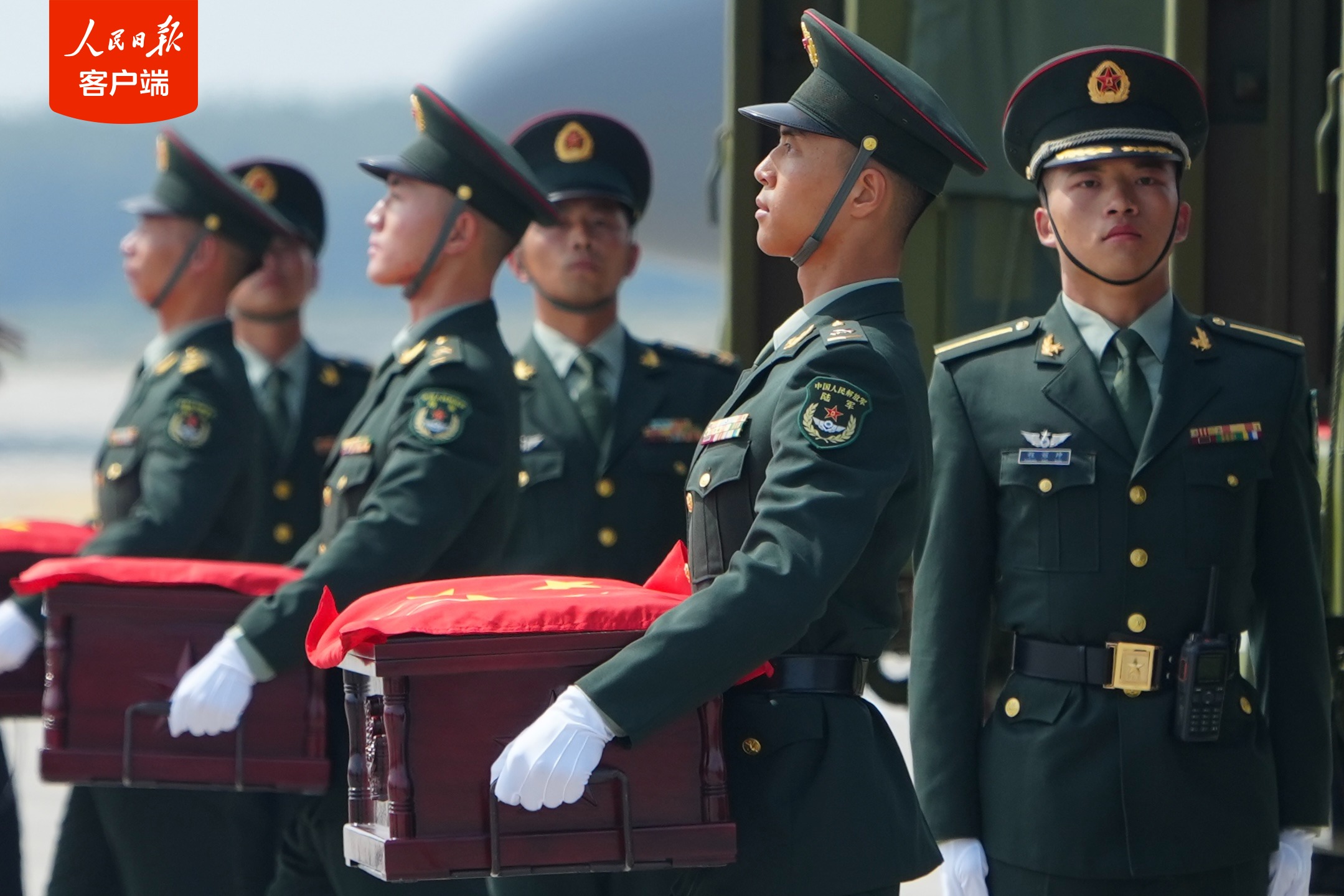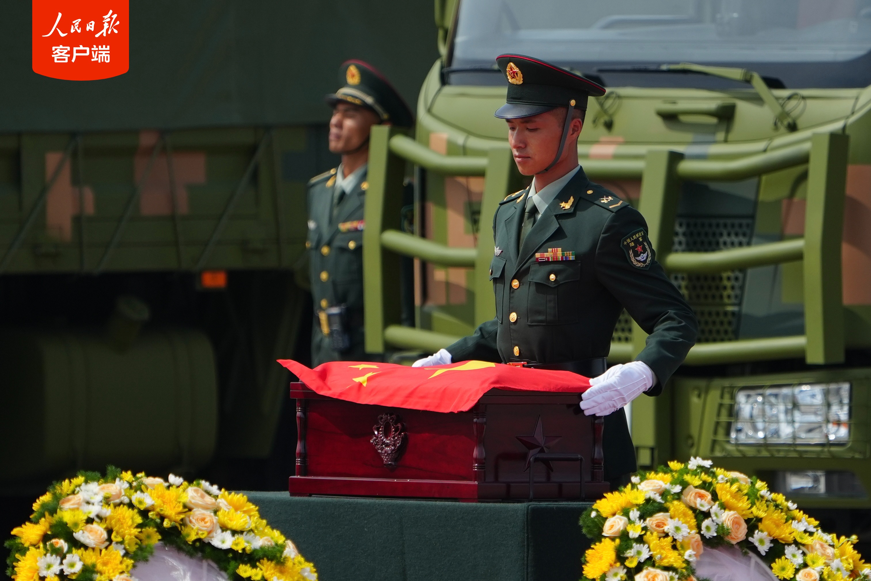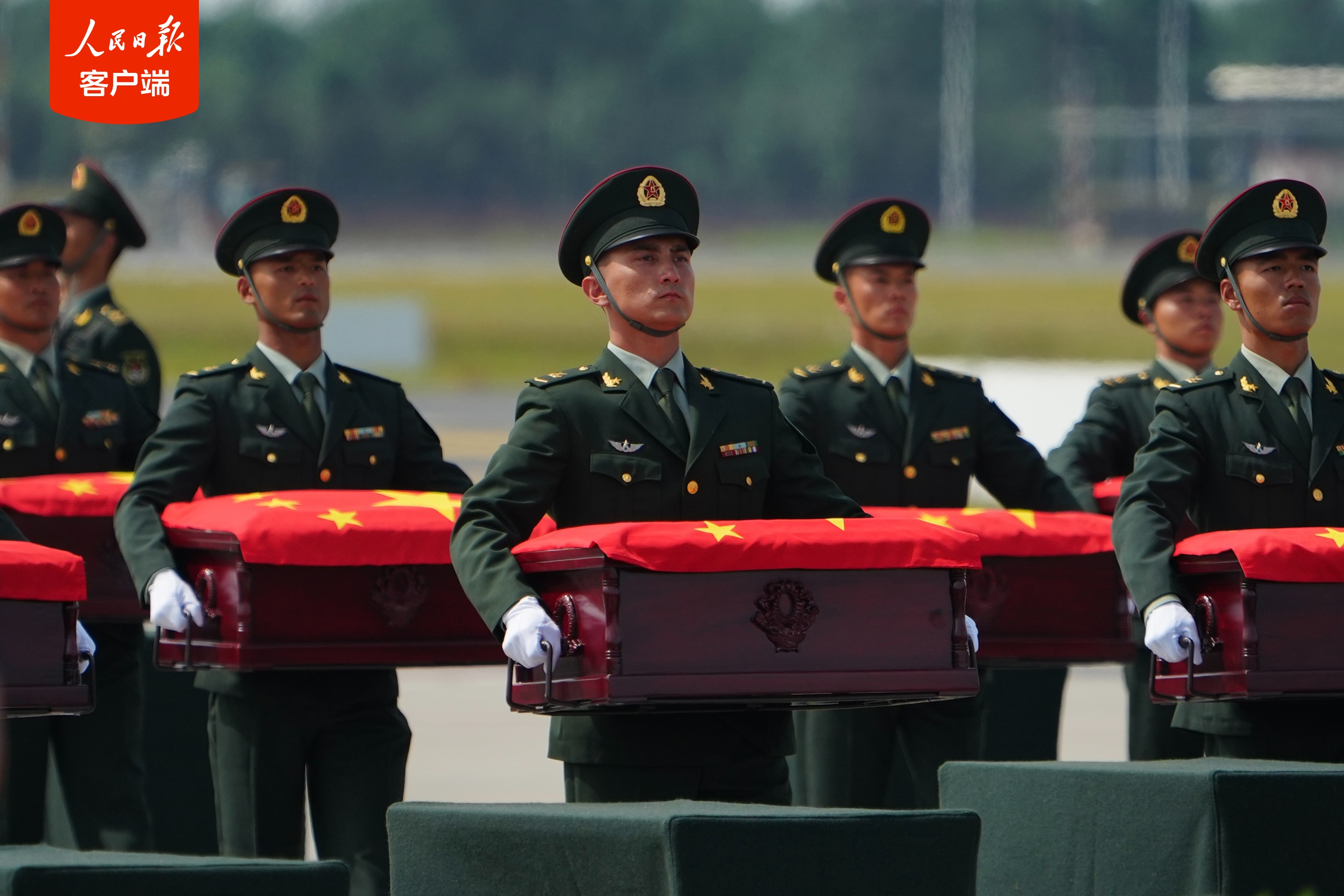 11时25分,第十二批在韩中国人民志愿军烈士遗骸迎回仪式开始。仪式现场庄严肃穆,志愿军烈士遗骸棺椁覆盖着鲜艳的五星红旗,到场迎接的解放军官兵军容威严、持枪鹄立,现场全体人员向烈士遗骸行三鞠躬礼,以此表达对先烈们的深切缅怀和无尽哀思。