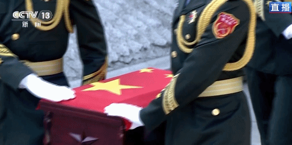 随着《思念曲》再次奏响,礼兵抬起志愿军烈士棺椁,缓缓走向安葬地宫。