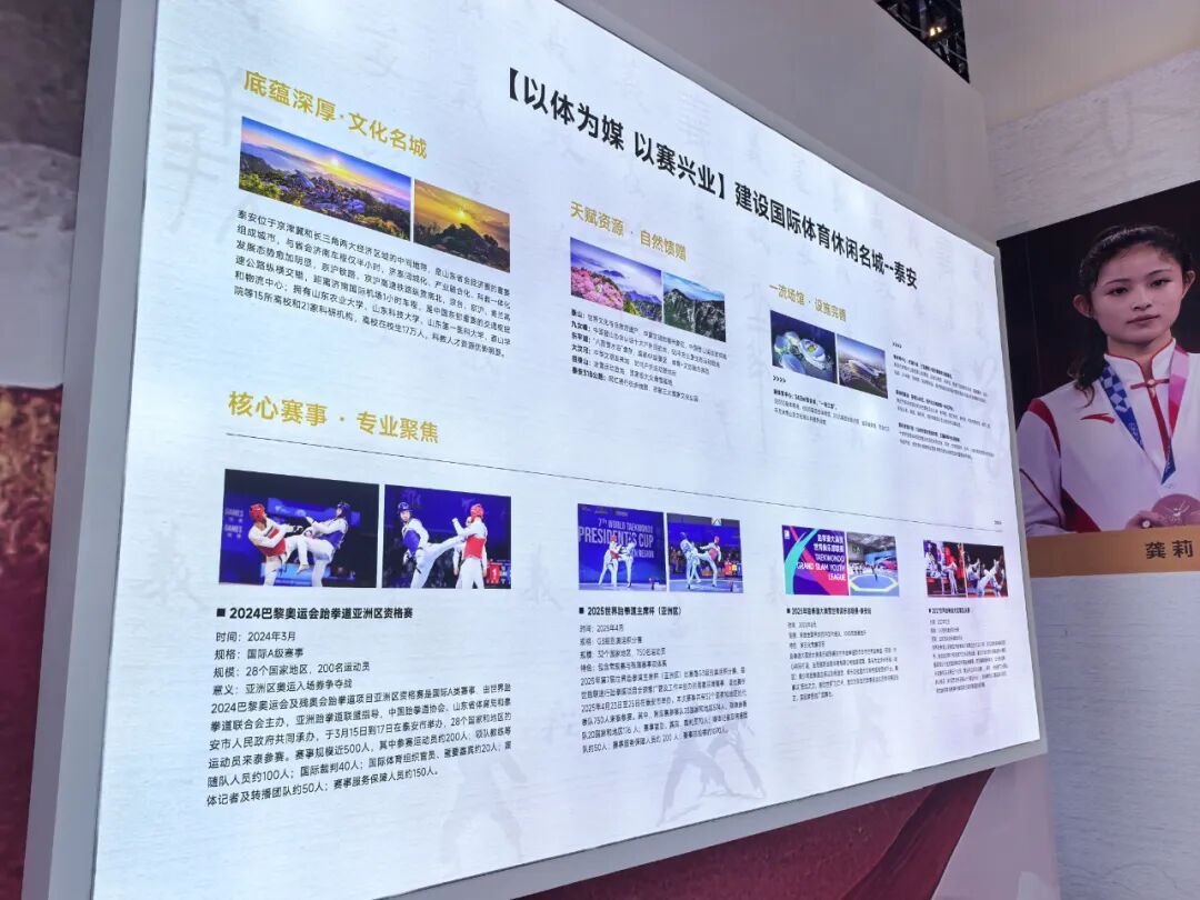 在国家体育总局拳击跆拳道运动管理中心展区,泰安“以体为媒、以赛兴业”的发展成果格外亮眼——展区内的“建设体育休闲名城”展板,详细呈现了泰安的交通优势、多样自然资源与完善场馆设施,更聚焦跆拳道项目的丰硕成绩。