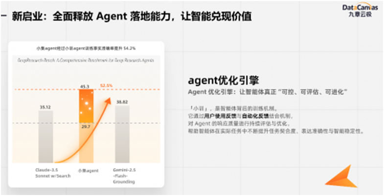 在缪旭看来,先进的强化学习能力加速了智能体AI发展,九章云极-新启业正成为企业智能体的Agent优化引擎。这背后正是九章云极在强化学习+智能体应用技术加持下,快速推出的新一代智能体智算服务:通过对响应质量进行持续评估与优化,帮助智能体Agent在实际任务中不断提升任务契合度、表达准确性和智能稳定性。
