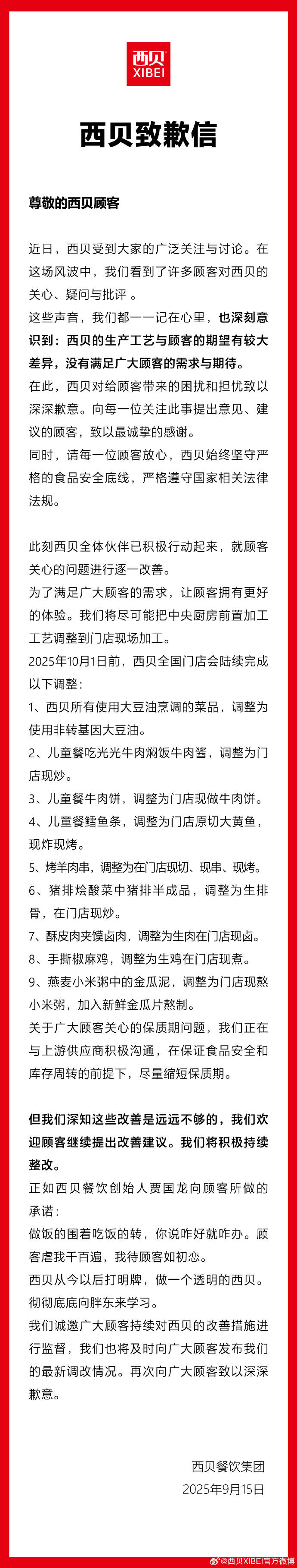 西贝发布致歉信!儿童餐等部分菜品调整为门店现做