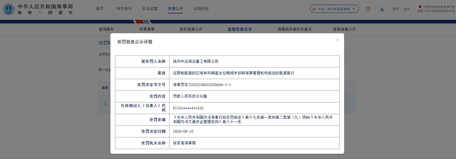 齐鲁晚报·齐鲁壹点记者于中国海事局监管信息公开栏获悉,9月15日,扬州中远海运重工有限公司(下称“扬州中远海运重工”)收张家港海事局罚单,处罚决定书文号:海事罚字[2025]06022020494-1-1。