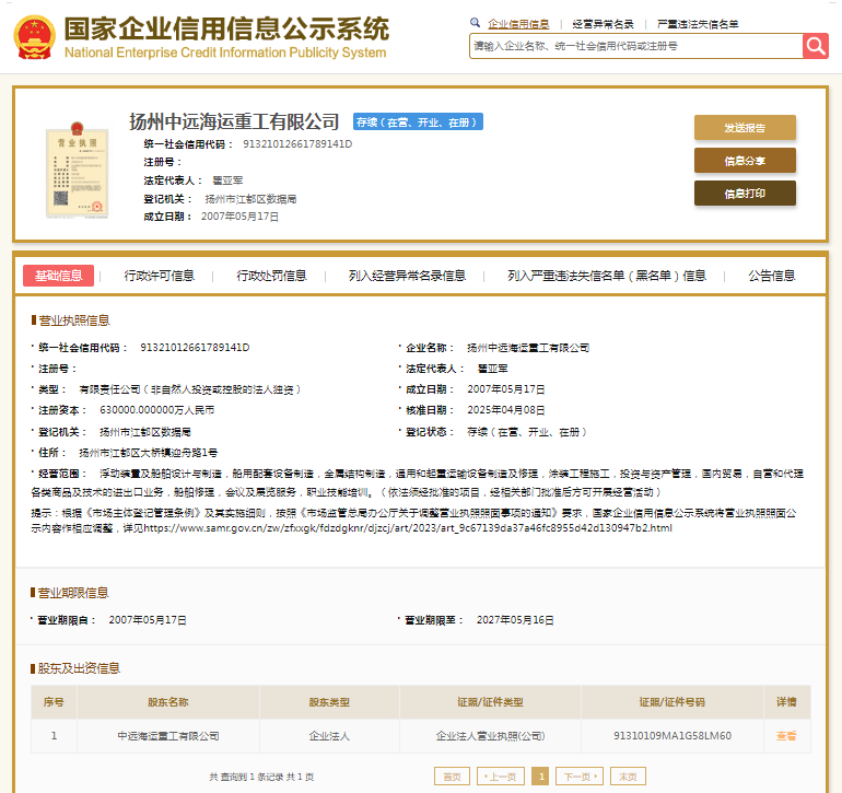 国家企业信用信息公示系统显示,扬州中远海运重工有限公司成立于2007年,注册资本630000万元人民币,法定代表人为翟亚军,公司由中远海运重工有限公司全资持股。