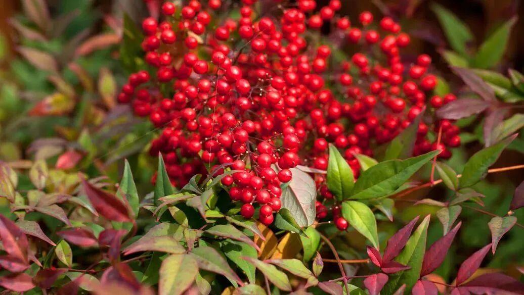 南天竹果实鲜艳,似一颗颗红豆串联,但植物全株有毒。中毒症状表现为兴奋,脉搏先快后慢且不规则,还会出现血压下降、肌肉痉挛、呼吸麻痹、昏迷等症状。