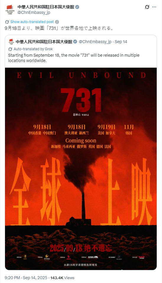中国驻日本大使馆X账号14日晚间用中日双语转发电影《731》海报,引发广泛关注和讨论。有网民表示,“即使日本对731部队的暴行视而不见,历史事实也不会改变”,“日本政府在二战期间对中国人民和亚洲人民犯下了滔天罪行,如果日本不反省战争罪行,继续发动战争,必将走向灭亡。”