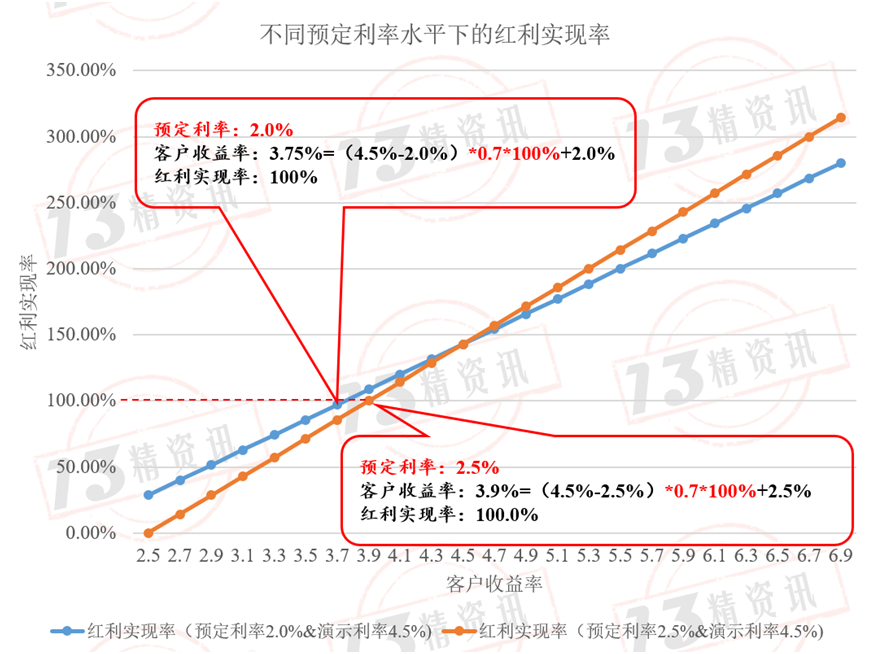 客户收益率的计算公式可拆解为:客户收益率=(演示利率-预定利率) ×演示分配比例×红利实现率+预定利率。