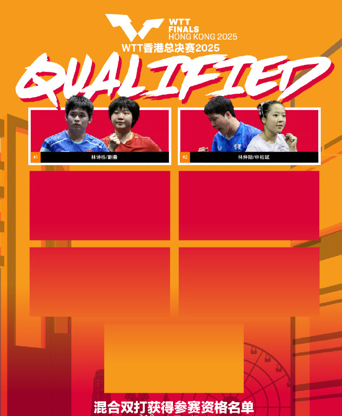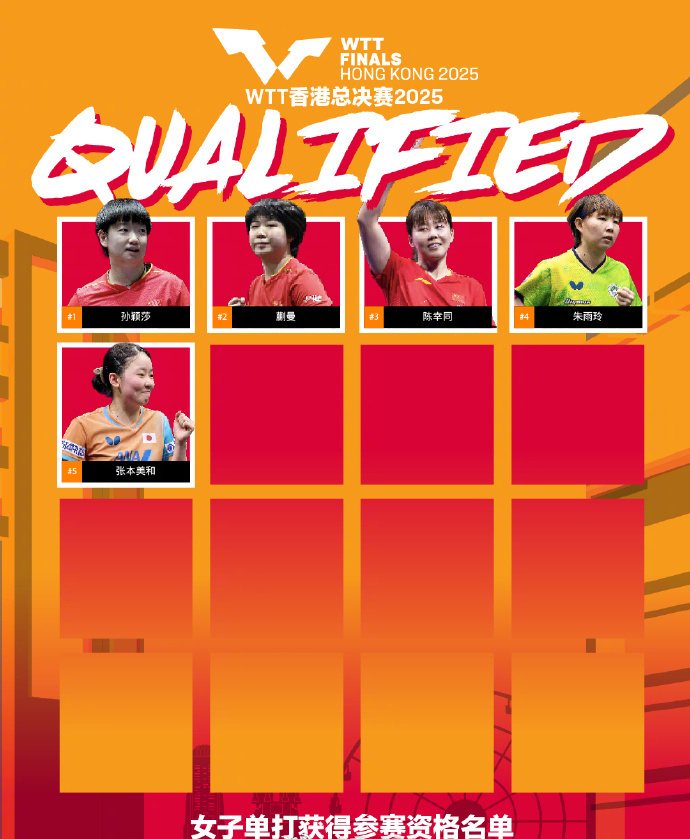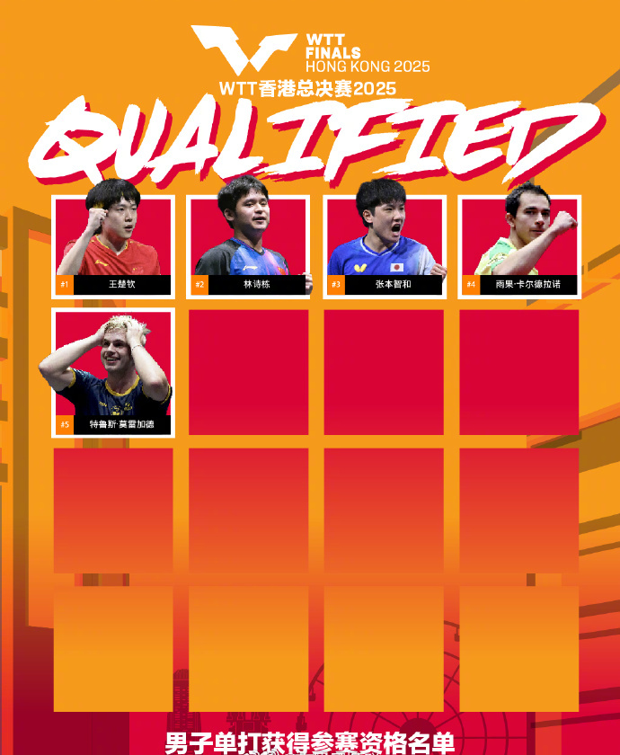 加油!孙颖莎王楚钦获2025WTT香港总决赛参赛资格 人民日报客户端 2025-09-17 1.6万 WTT世界乒联发布截至目前获得2025WTT香港总决赛参赛资格的运动员名单。国乒5人已获香港总决赛参赛资格。 男单:王楚钦、林诗栋、张本智和、雨果、莫雷加德 女单:孙颖莎、蒯曼、陈幸同、朱雨玲、张本美和 混双:林诗栋/蒯曼、林仲勋/申裕斌 (人民日报客户端) 责任编辑:朱洪蕾