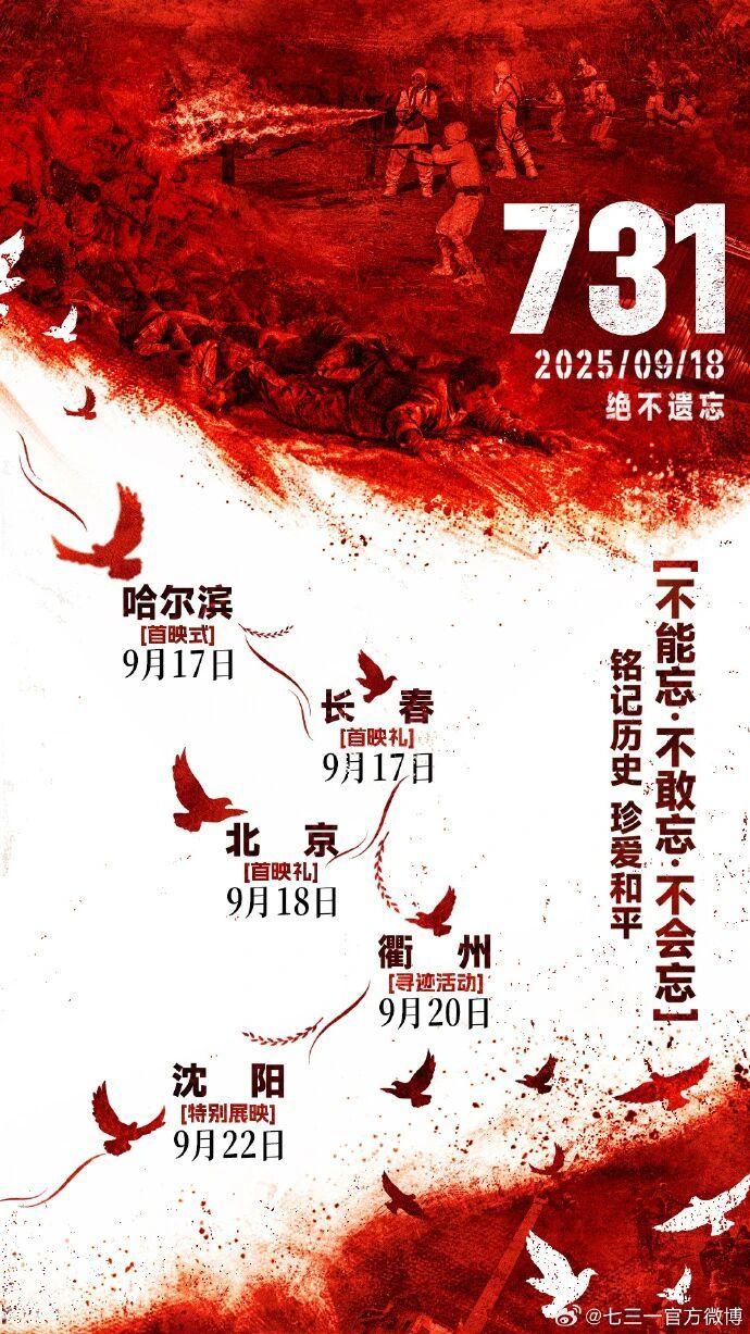 9月18日起,电影《731》将在全球多地上映,全球首映式将于今天在哈尔滨举行。该片主要讲述了抗战胜利前夕,侵华日军为了扭转战局在黑龙江哈尔滨平房区开展细菌战研究,屠戮百姓进行人体实验的故事。侵略者曾企图掩盖真相,但中国人民揭露历史的决心永不磨灭!