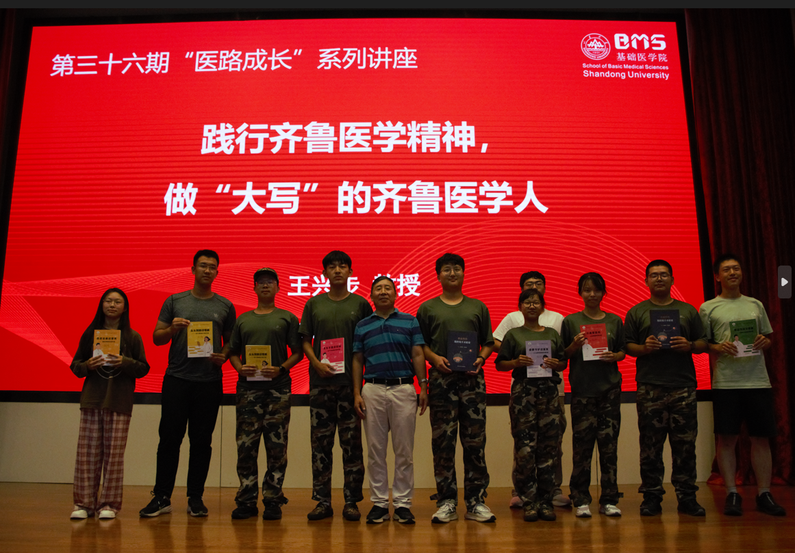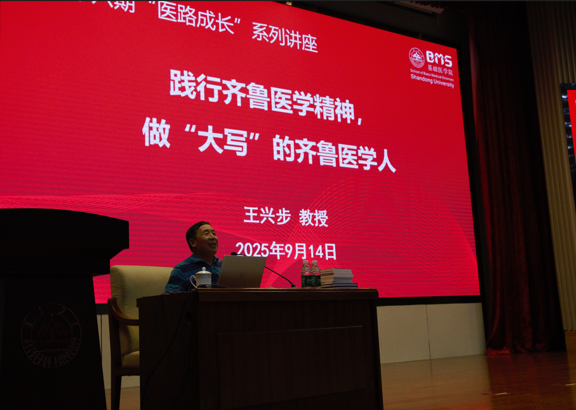 “上帝把夏天的艺术赐给瑞士,把春天的赐给西湖,秋和冬的全赐给了济南……”讲座伊始,王兴步教授引用老舍《济南的秋天》中的名句,以诗意的开场拉近了新生与济南、与山大、与齐鲁医学的距离。他为来自祖国各地的学子成为“学无止境,气有浩然”的新山大人,表示由衷自豪。