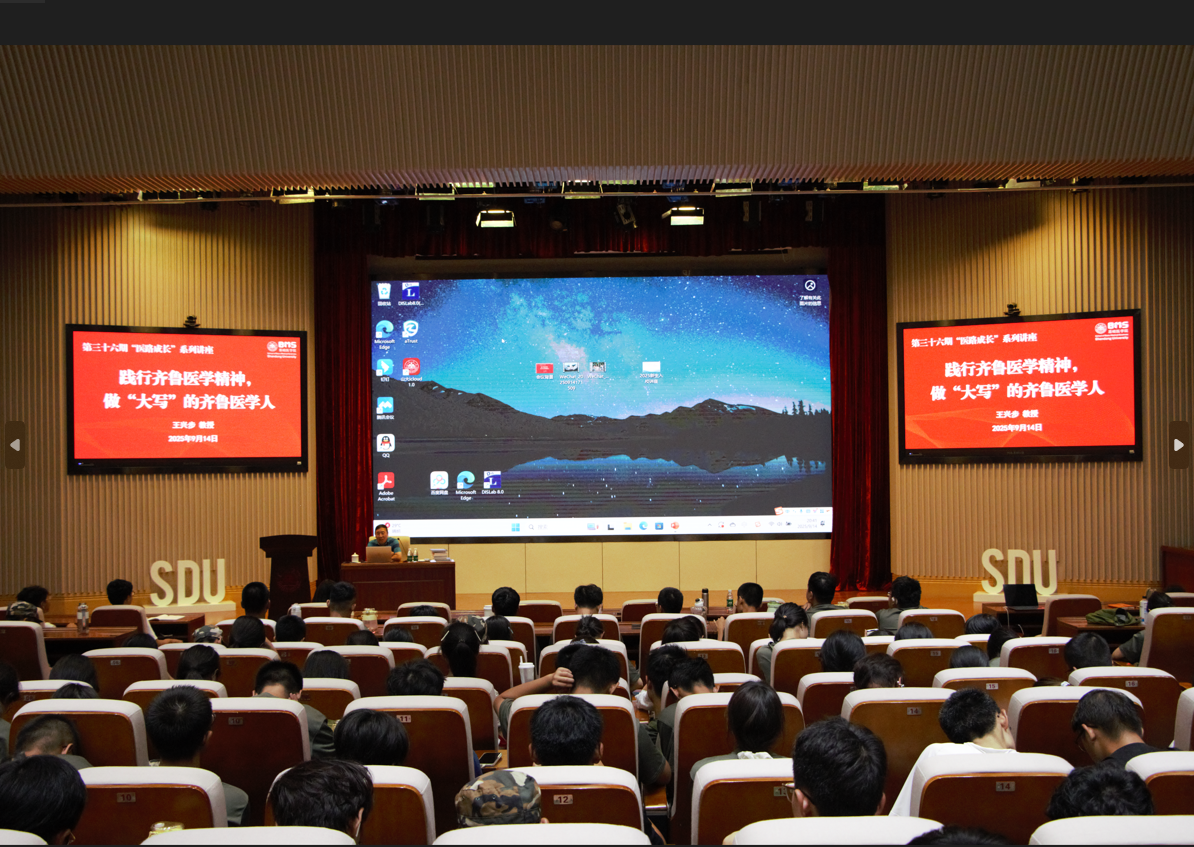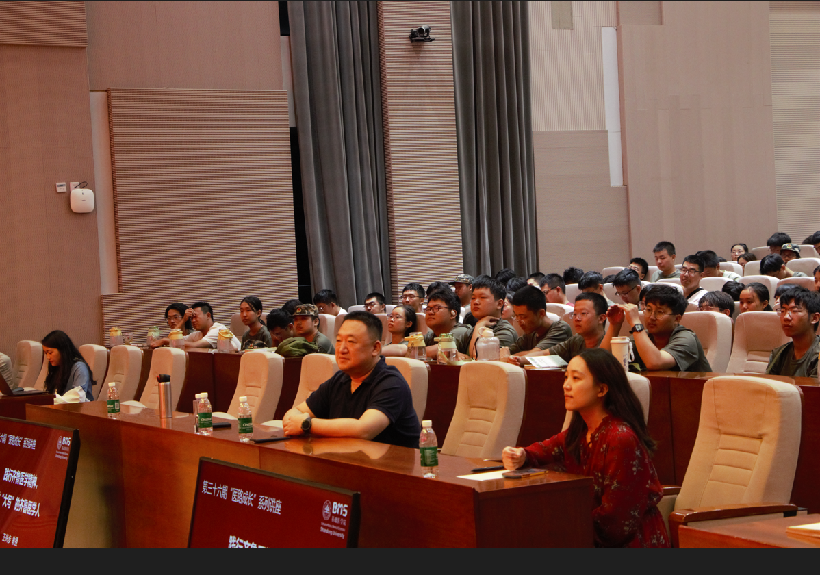 讲座中,《山东大学校歌》与《齐鲁医学校友歌》MV先后播放,旋律激昂、情感澎湃,进一步激发了同学们对母校的认同与对齐鲁医学传统的敬意。