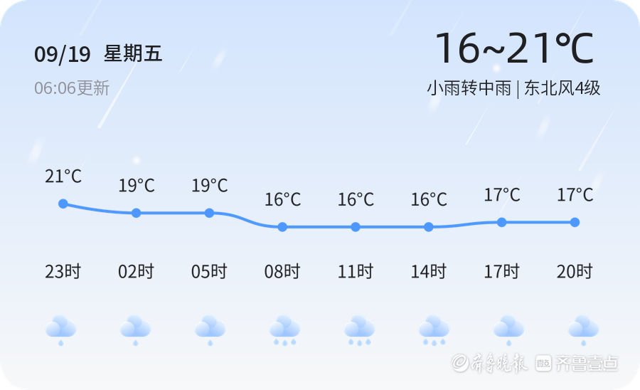 今天是9月19日,星期五,农历七月廿八。日照市今日天气为小雨转中雨,气温在16℃至21℃之间,东北风4级,空气湿度88%,PM2.5指数为23,空气质量良好。各区均出现不同程度的降雨,市民出行需携带雨具,注意交通安全。