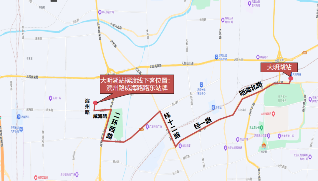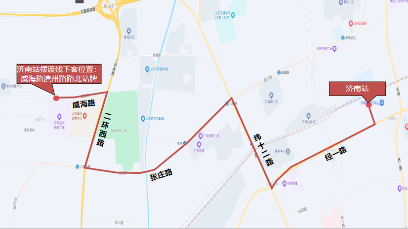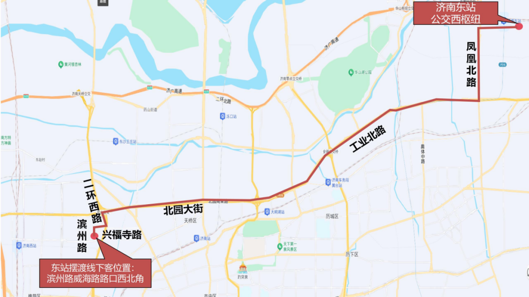由济南东站公交西枢纽发车沿王舍人大街向西、凤凰北路向南、工业北路向西、北园大街向西、二环西路向南、兴福寺路向西、滨州路向南至滨州路威海路路口西北角。