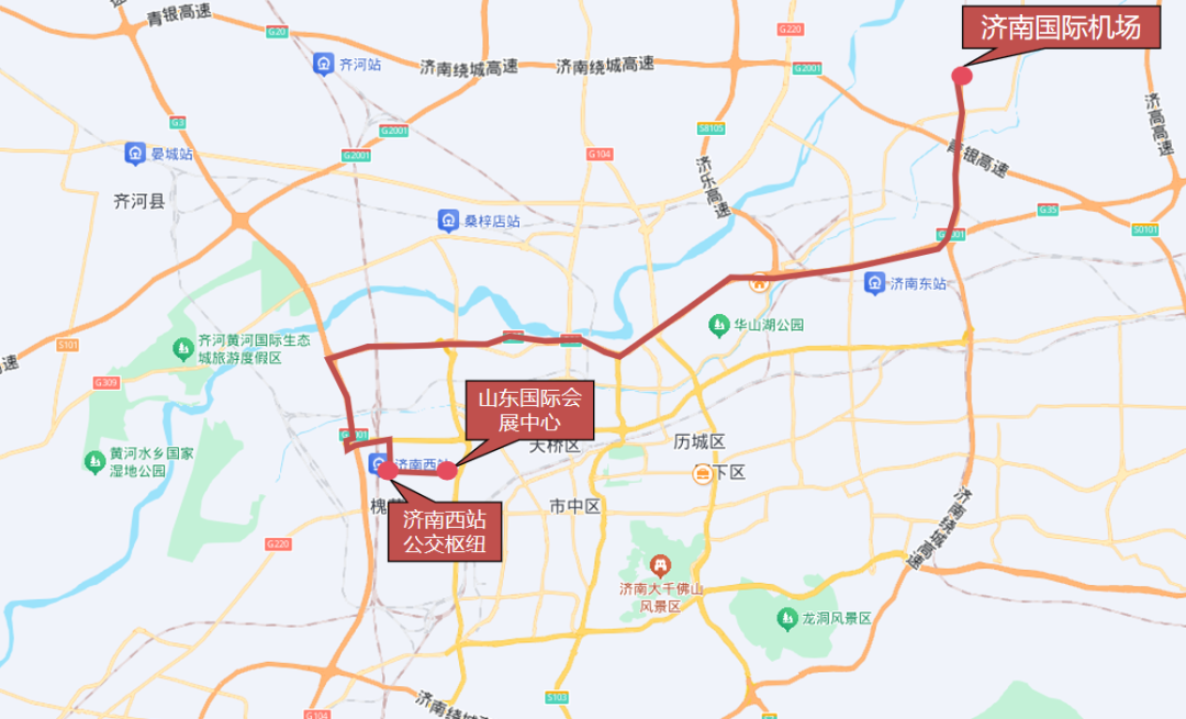 由济南国际机场发车,沿机场高速向南,经济广高速至国际医学中心高速出口,沿青岛路向东、齐州路向南至济南西站公交枢纽(如有参会乘客,沿日照路向东至日照路滨州路路口西南角下客)。